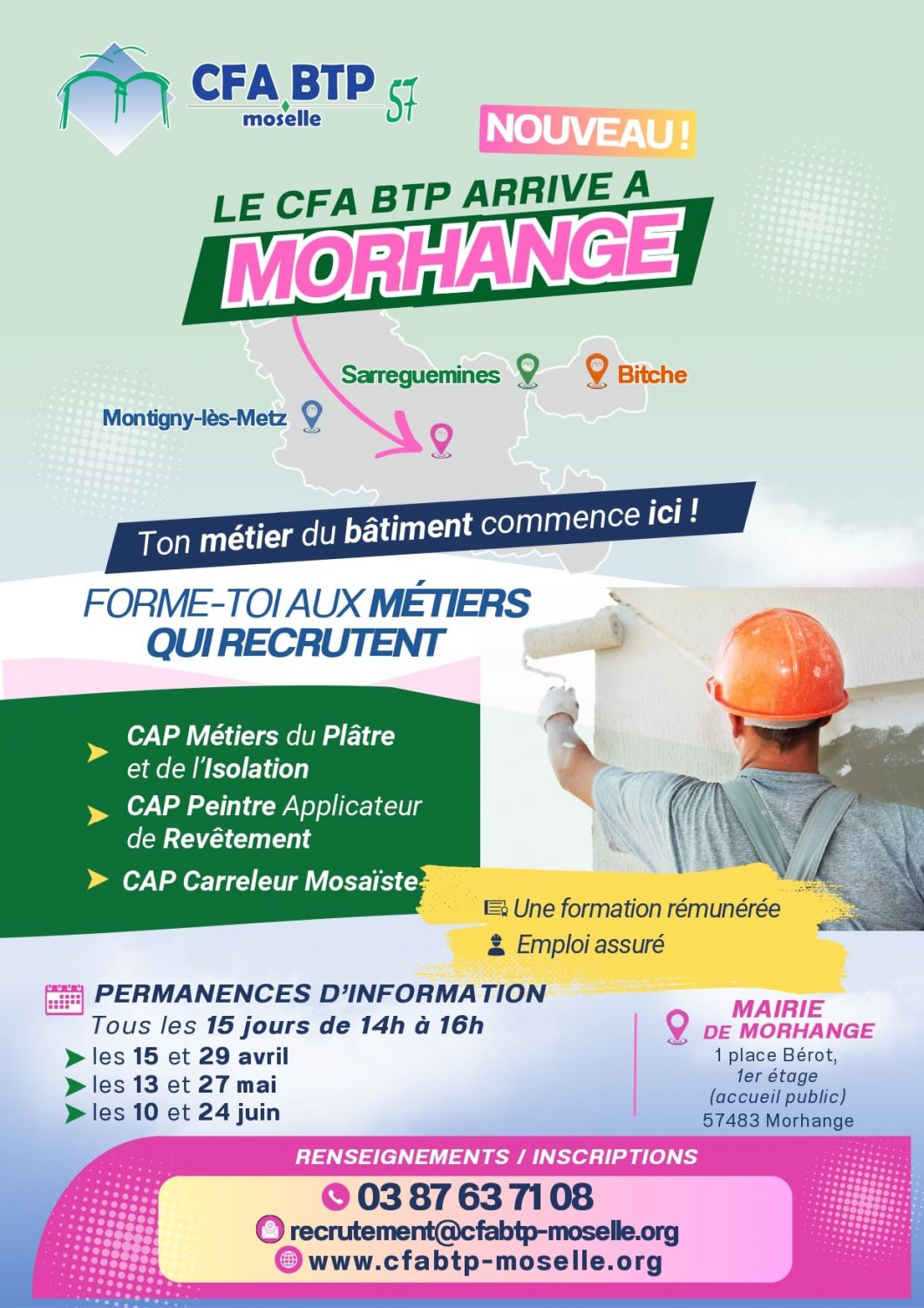 Ces permanences permettront de découvrir les formations proposées, notamment les CAP métiers du plâtre et de l’isolation, carreleur-mosaïste et peintre applicateur de revêtements, ainsi que les modalités d’inscription et les débouchés professionnels.