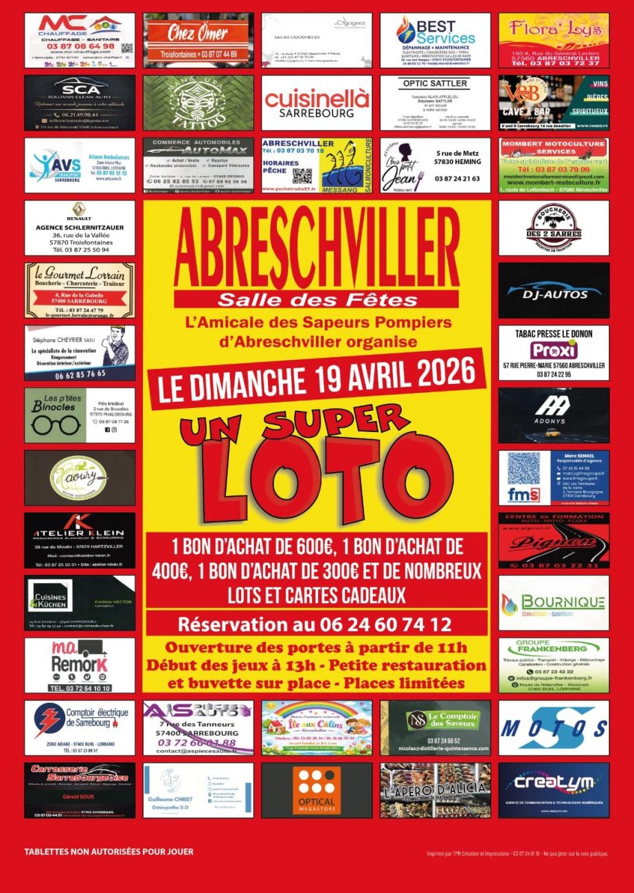 L’amicale des sapeurs-pompiers d’Abreschviller propose un loto à la salle des fêtes dimanche de 13h à 20h. Ouverture des portes dès 11h.