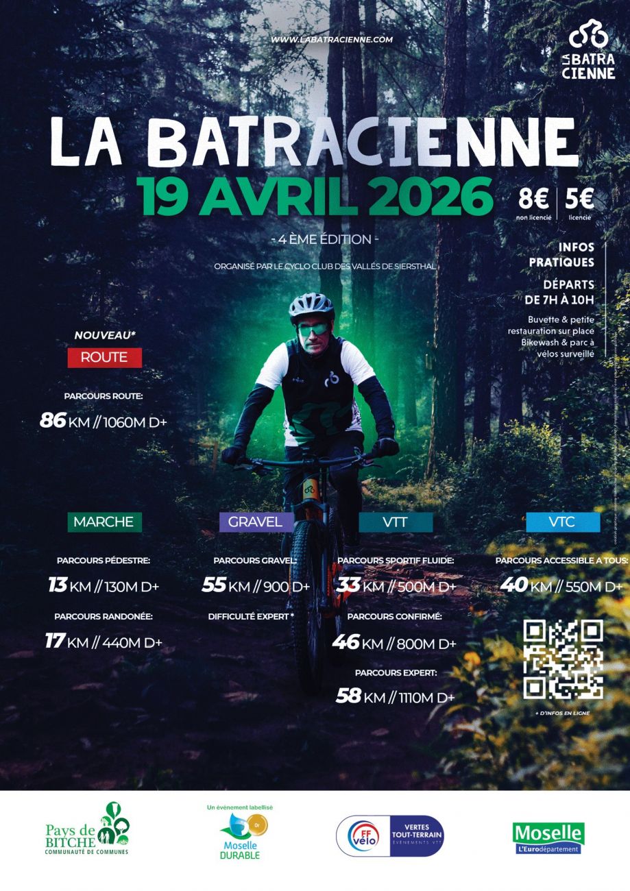 La 4e édition de la Batracienne c’est à Siersthal ce dimanche matin. Au programme des parcours VTT de 33, 46 et 58 km et gravel sur 55 km ; VTC de 40 km ; route de 86 km ; mais aussi des marches de 13 et 17 km.