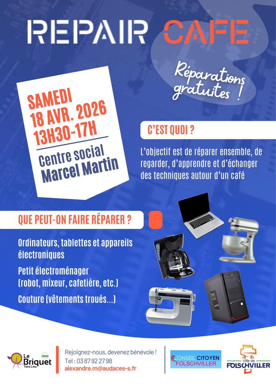 Un Repair Café est proposé samedi dès 13h30 à Folschviller. Vous pourrez peut-être y faire réparer vos objets défectueux ! Rendez-vous au centre Marcel Martin.