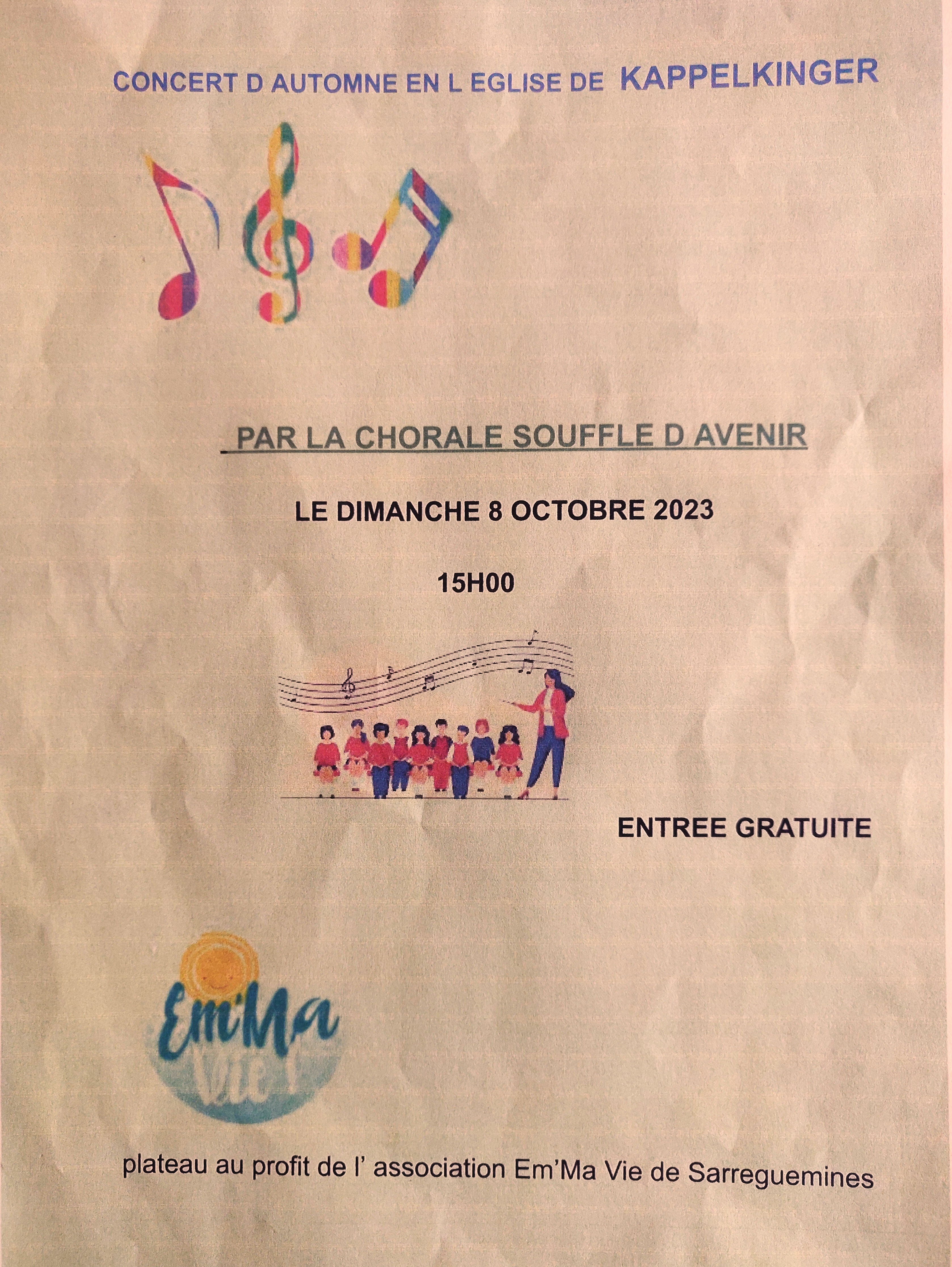 Les jeunes de la chorale Souffle d'Avenir de Sarralbe sont invités par le conseil de fabrique de Kappelkinger. Ils vont chanter pour la bonne cause, le plateau proposé pendant la pause sera entièrement reversé à l'association Em'Ma Vie de Sarreguemines.