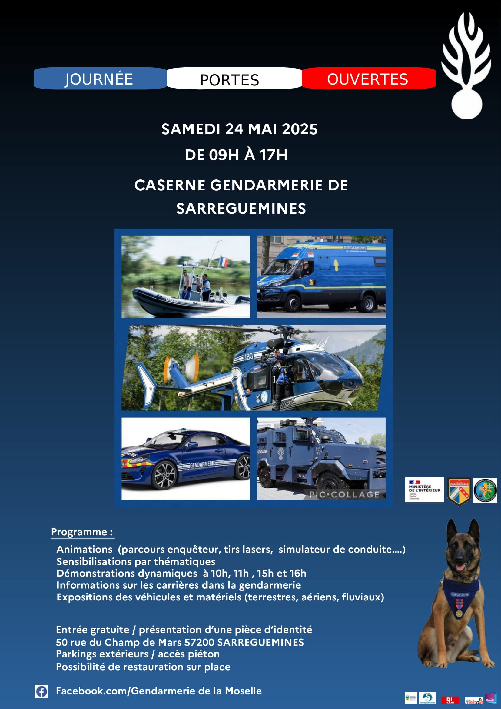 Ne manquez pas la journée portes ouvertes à la caserne gendarmerie de Sarreguemines le samedi 24 mai de 9h à 17h.
