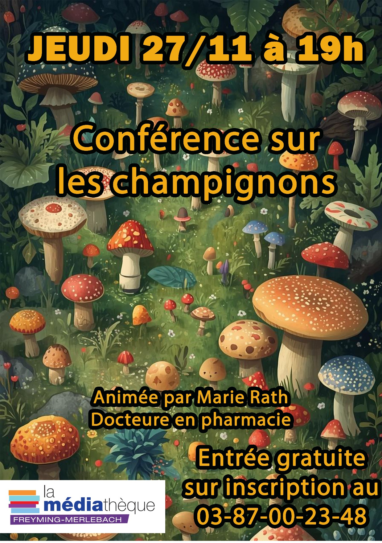 Marie RATH, Docteure en Pharmacie, animera une conférence aux accents automnaux autour des champignons, qu'ils se mangent, qu'ils soignent ou qu'ils soient dangereux pour l'homme. Venez (re)découvrir le monde fascinant des sous-bois !