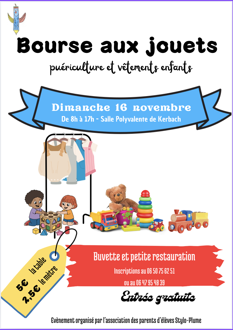 Le dimanche 16 Novembre, l'association des parents d'élèves STYLO PLUME accueillera une grande bourse aux jouets, un rendez-vous parfait pour dénicher des trésors ludiques à petit prix !! Le tarif pour une table est de 5 EUROS, et le prix pour 1m linéaire de 2,5 euros. Les inscriptions se terminent le 9 novembre, alors pensez à réserver rapidement. De plus, une buvette et une petite restauration seront disponibles sur place pour agrémenter votre visite. Pour plus de renseignements, contactez le 06 50 75 62 51.
