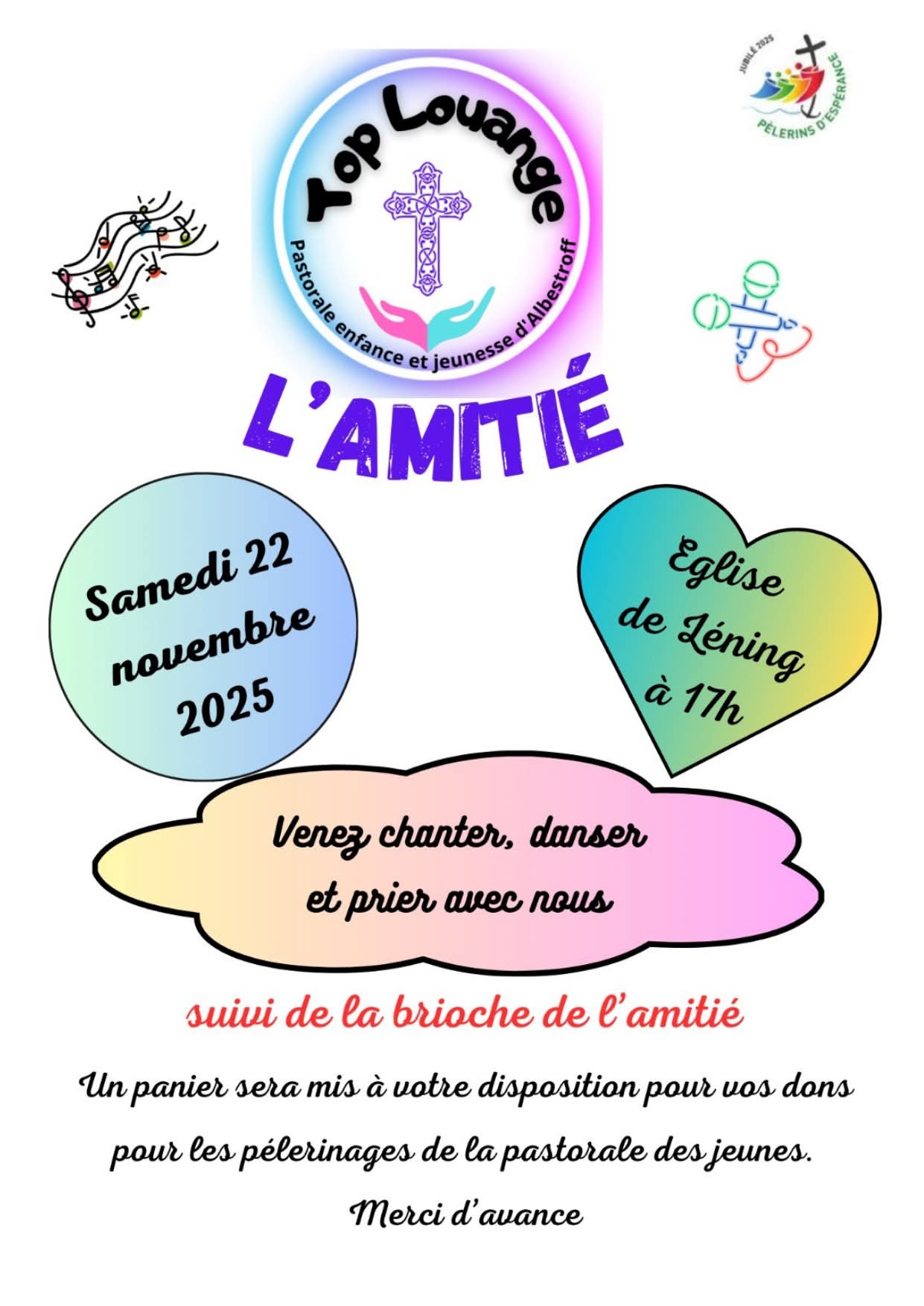 Rendez-vous le 22 novembre à 17h en l'église de Léning au top louange organisé par la pastorale de l'enfance et de la jeunesse d'Albestroff sur le thème de l'amitié.