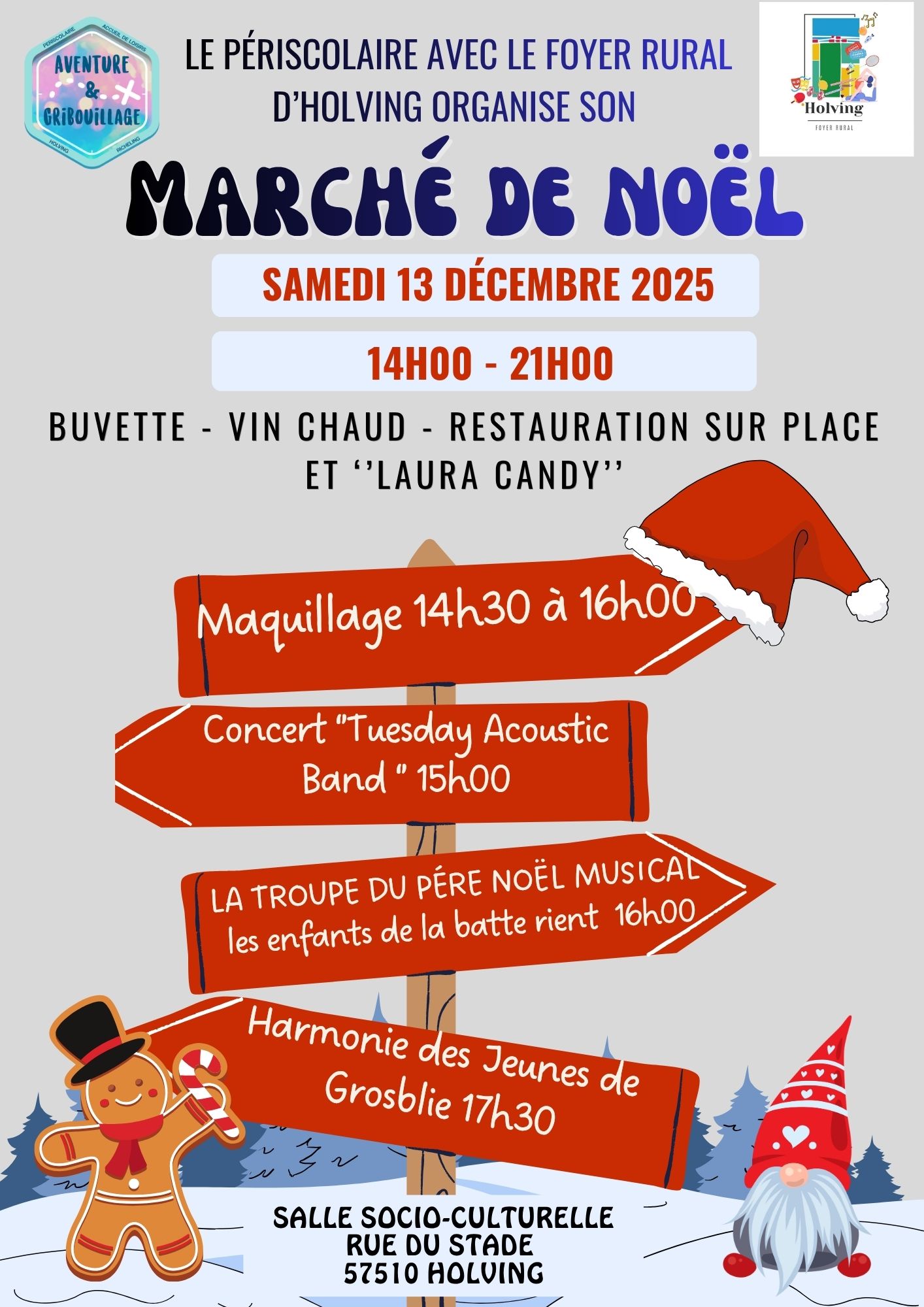 Le périscolaire d'Holving - Richeling, avec le soutien du Foyer Rural d'Holving, organise son Marché de Noël. L'événement se tiendra le 13 décembre 2025 à la salle socio-culturelle. Le marché sera ouvert de 14h00 à 21h00. Une maquilleuse pour enfant sera présente de 14h30 à 16h00. À 15h00, c'est le groupe 'Tuesday Acoustic Band' accompagné de la chorale Voix si Voix la qui inviteront les visiteurs par des airs musicaux et des chants, à entrer dans la magie de Noël. Il y aura également vers 16h00 un défilé aux lampions accompagné du Père Noël en calèche, suivi en musique par 'les enfants de la batte rient'. Les enfants auront la possibilité d'acheter des lampions pour participer au défilé. Et enfin, à partir de 17h30, nous pourrons entendre l'Harmonie des Jeunes de Grosbliederstroff jouer des chants de Noël à l'aide d'instruments de musique.
