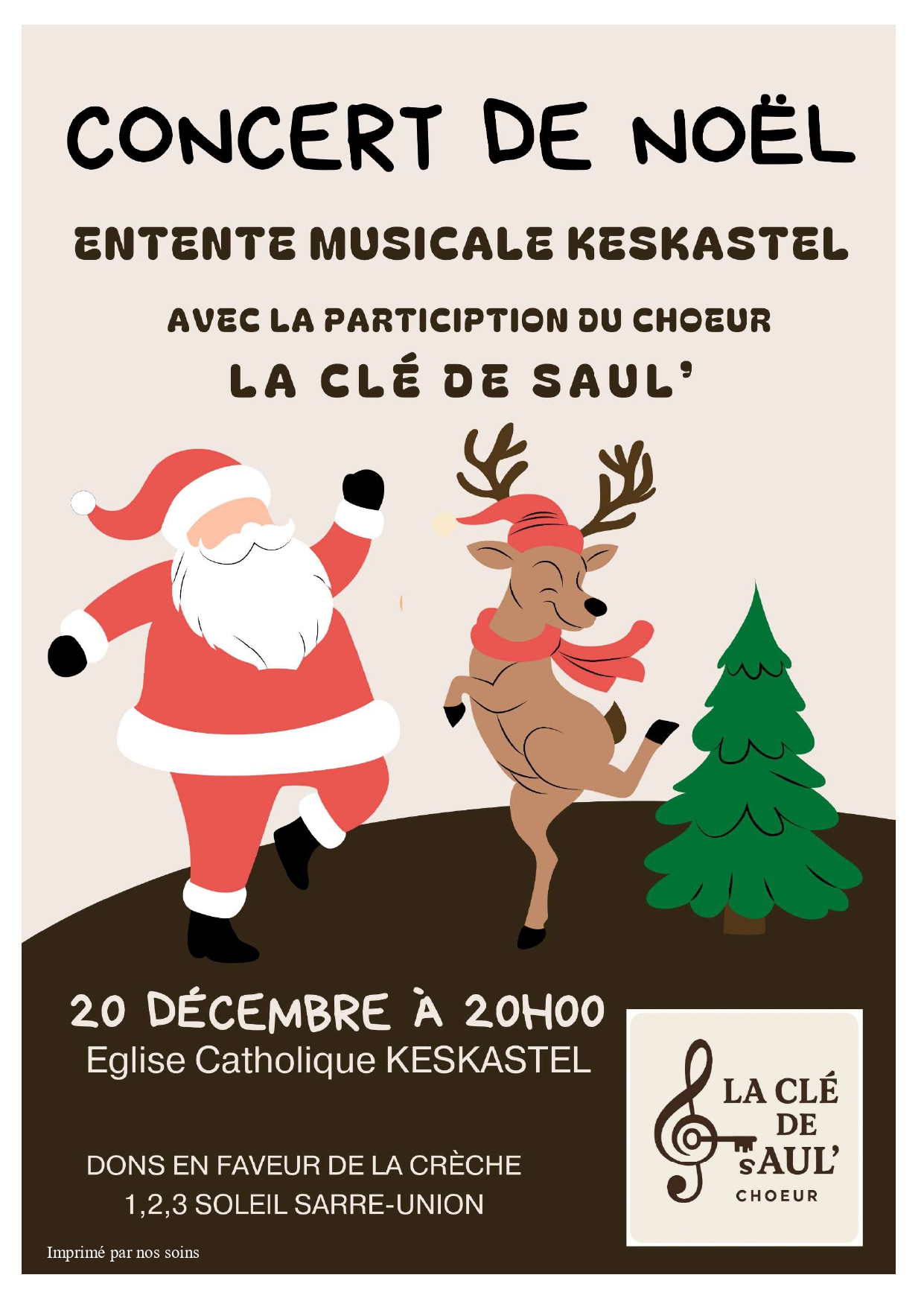 L’entente Musicale de Keskastel vous invite à son traditionnel Concert de Noël le samedi 20 décembre à 20 heures à l’Eglise Catholique de Keskastel. L’orchestre interprètera des oeuvres connues et variées. S’en suivra la chorale « La Clé de Saul » de Vic sur Seille composée d’une cinquantaine de choristes qui interprètera de célèbres chants de Noël