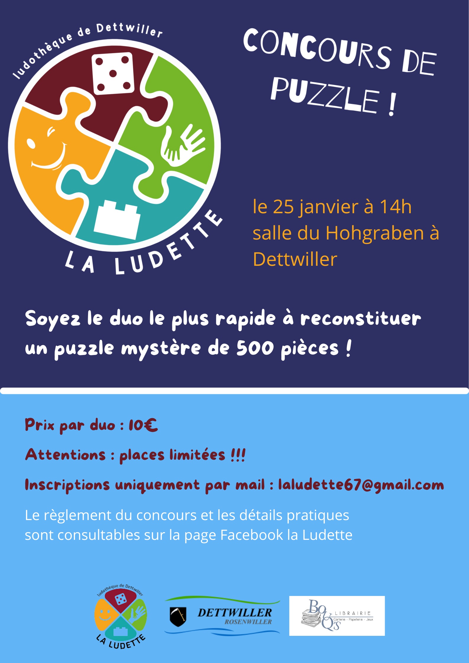 La Ludette vous accueille à Dettwiller dès 13h30 pour tirer au sort un des 2 puzzles en compétition. Le concours démarre à 14h, pause gourmande de 15h30 à 16h et fin à 17h30. Vous pouvez amener tout matériel qui vous serait utile (boite, lampes, etc.). Nous vous offrons le puzzle, terminé ou non !