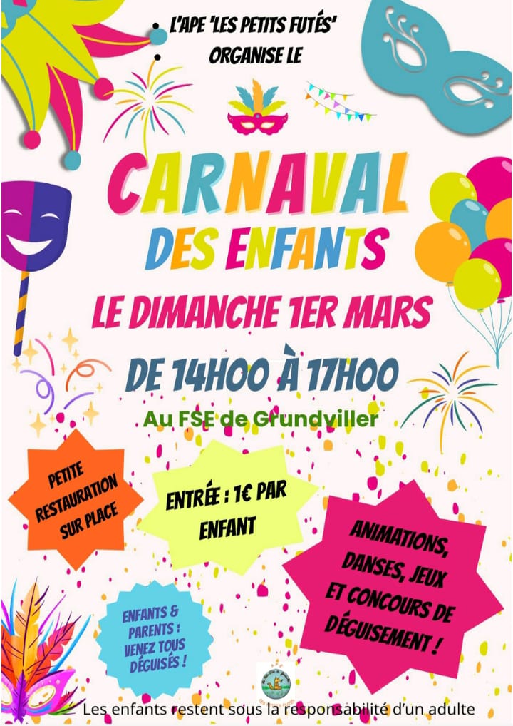 Comme chaques années, l'association les petits futés organise le carnaval des enfants le dimanche 1er mars de 14h à 17h au fse de Grundviller.