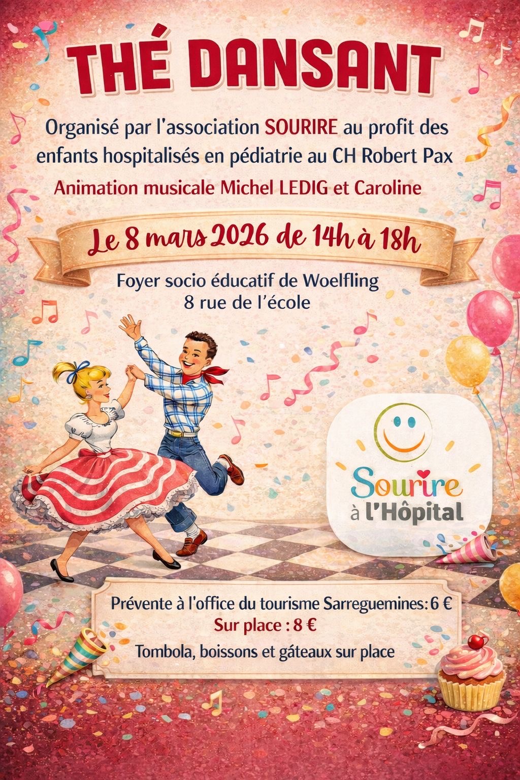 L'association Sourire à l'hôpital et l'équipe de pédiatrie du Centre hospitalier Robert Pax de Sarreguemines organisent un thé dansant dimanche 8 mars 2026 de 14h à 18h à Woelfing les Sarreguemines au foyer Socio éducatif, 8 rue de l'école.