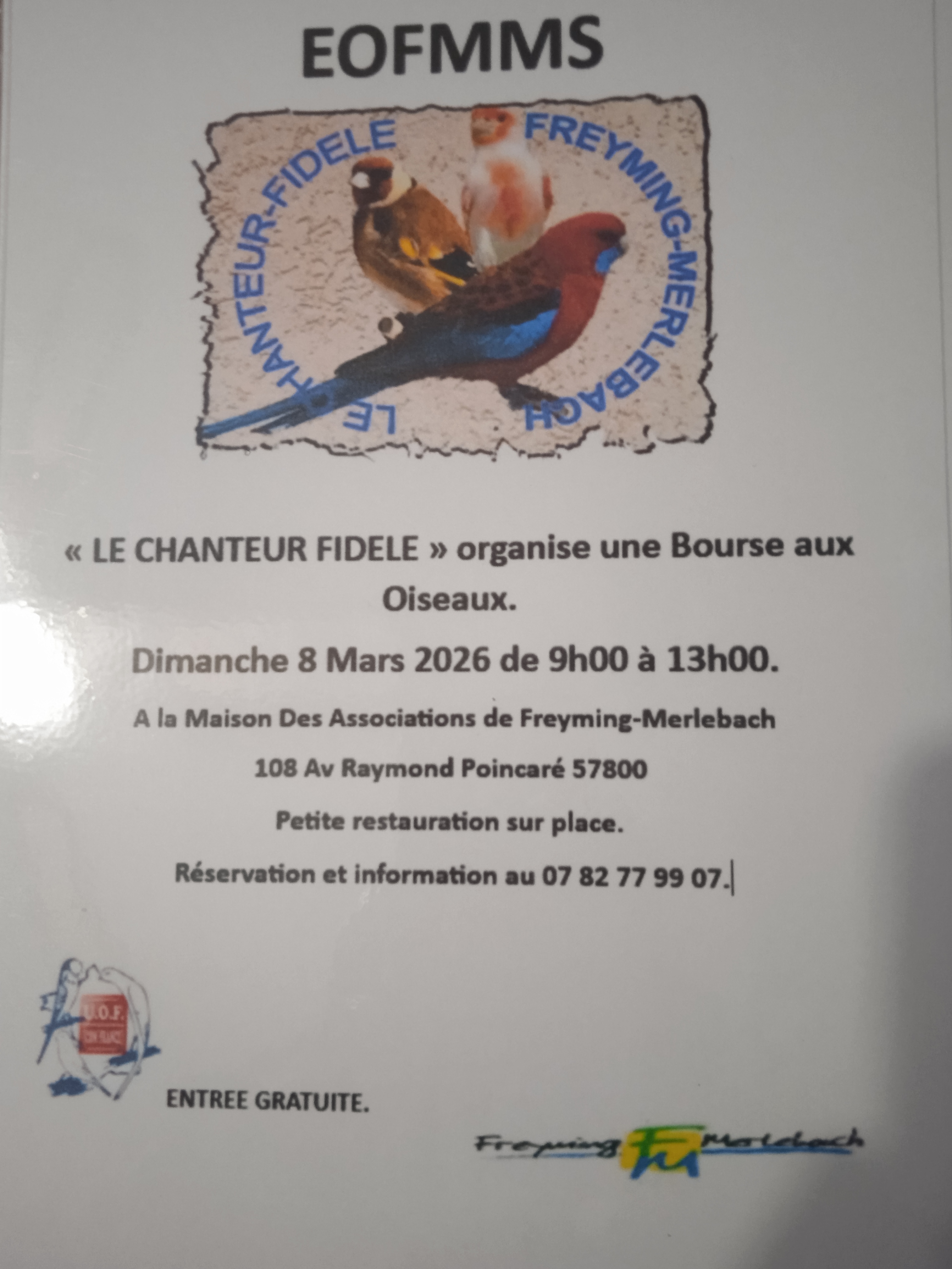 Le Chanteur Fidèle organise une bourse aux oiseaux d'ornements. Plusieurs variétés d'oiseaux seront exposées dimanche 8 Mars 2026 de 9h00 à 13h00.
