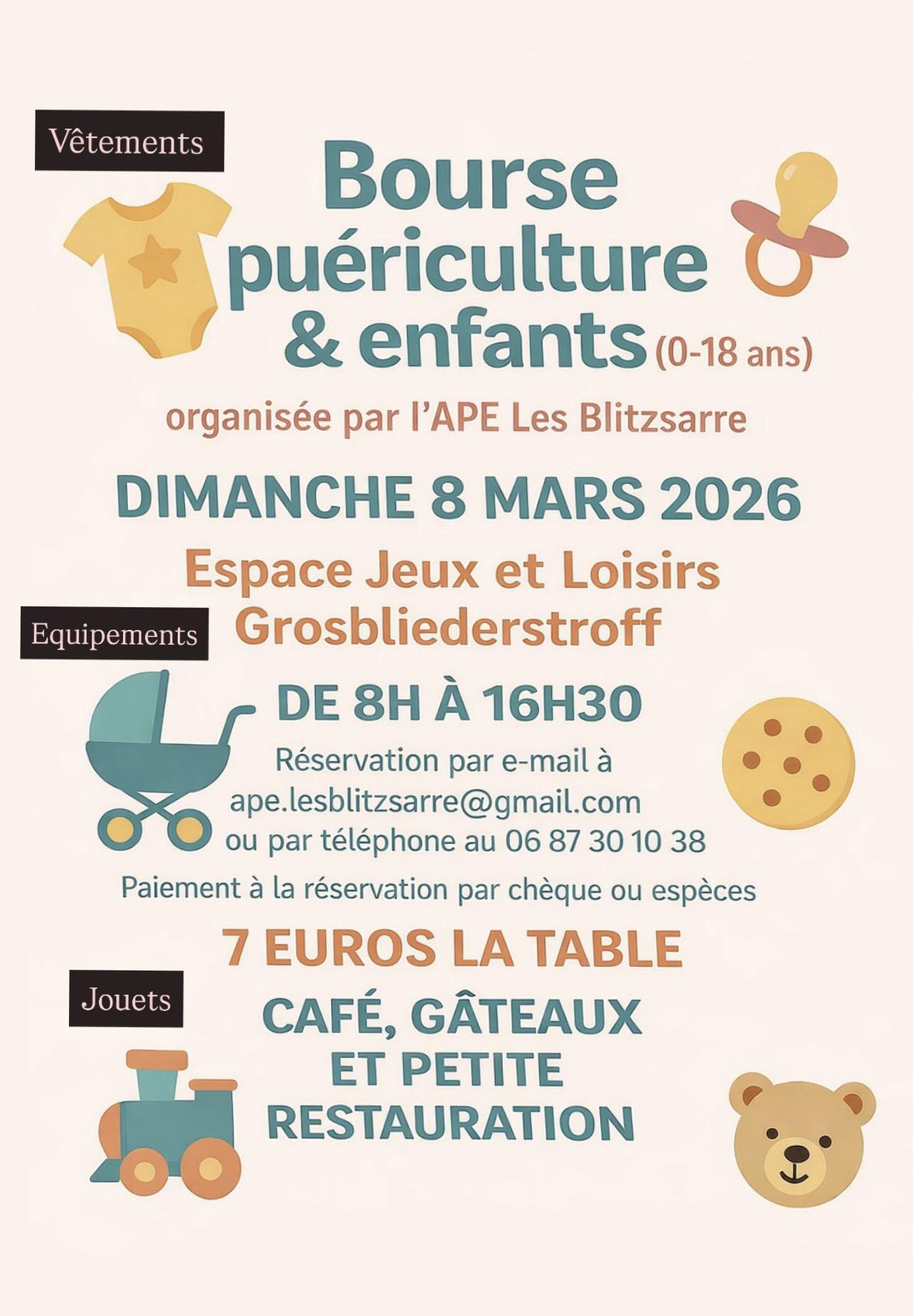 L’Association de Parents d’Élèves de Grosbliederstroff organise une bourse puériculture & enfants dimanche 8 mars 2026 à l'Espace Jeux et Loisirs de 8h00 à 16h30.