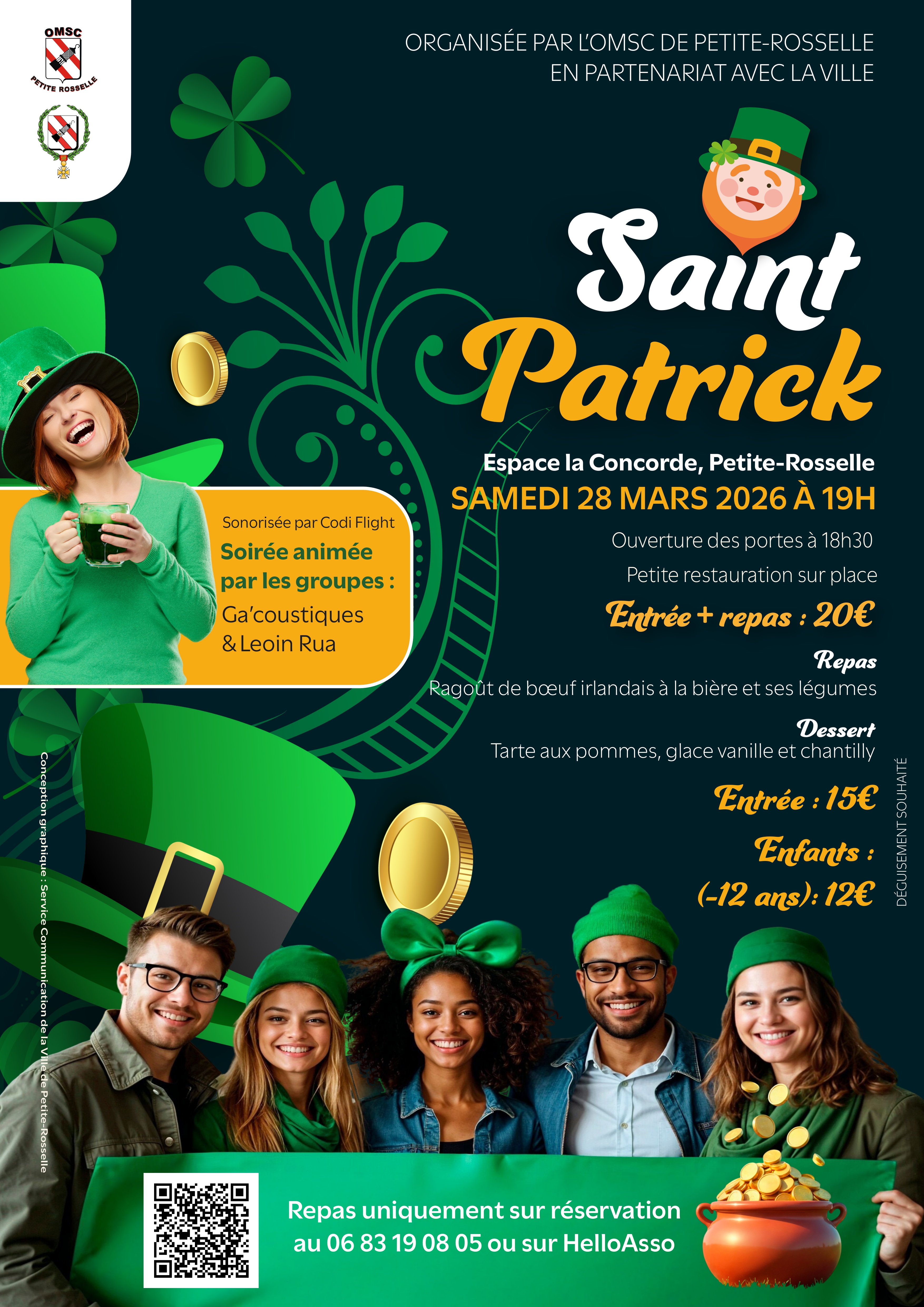 Sortez vos plus beaux habits verts, l’OMSC de Petite-Rosselle et la Ville vous préparent une soirée irlandaise mémorable ! Que vous veniez pour la musique, le ragoût ou simplement l'ambiance, on vous attend nombreux pour faire vibrer l'Espace la Concorde.