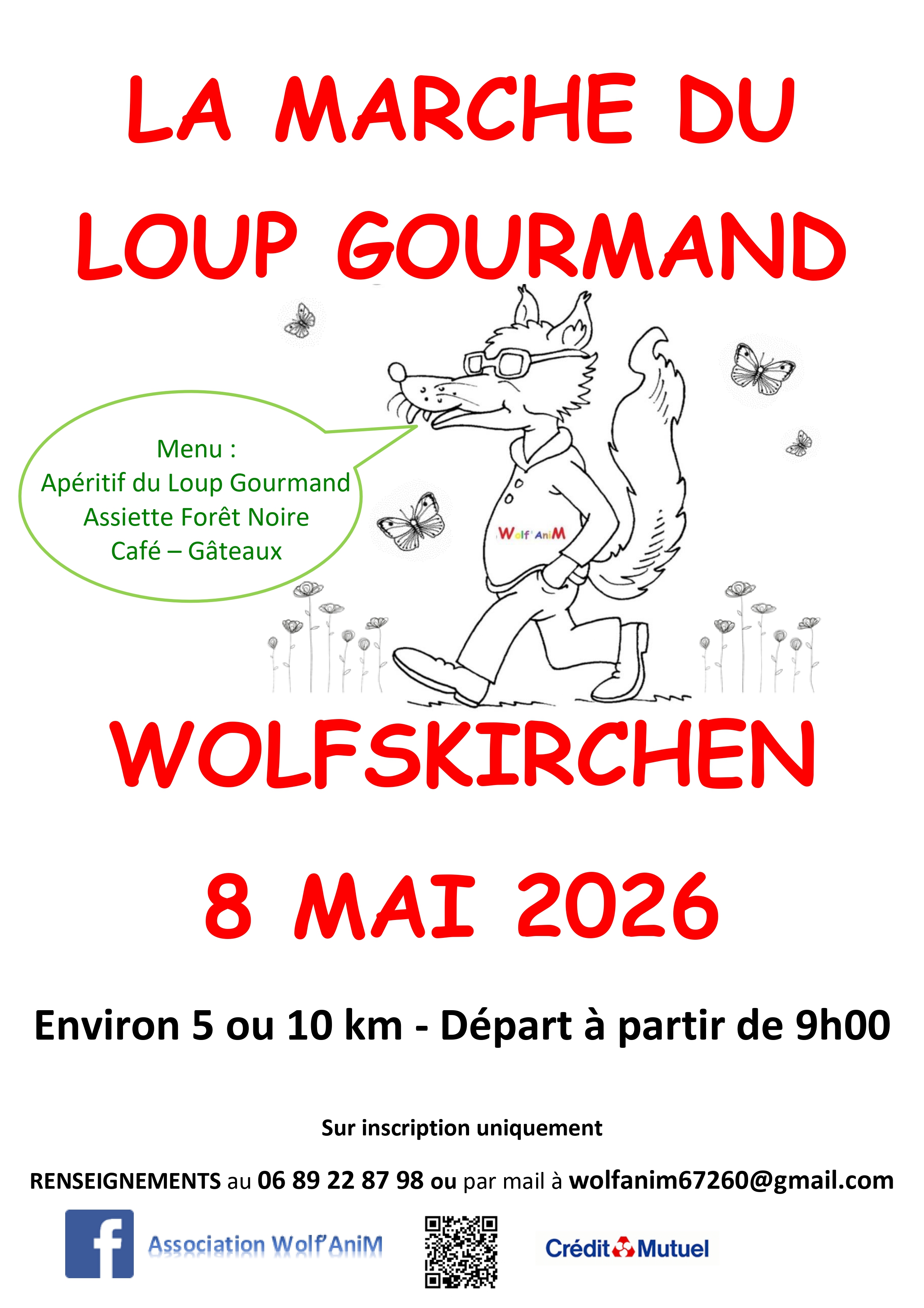 Marche du Loup Gourmand à WOLFSKIRCHEN le 8 mai 2026. Pour cette nouvelle édition, nous vous invitons à découvrir nos alentours à travers une marche de 5 ou 10km environ. Au menu nous nous proposons une entrée, suivi de nos “Grumbeereckiechle” galettes de pomme de terre façon Forêt Noire (jambon Forêt Noire et fromage blanc). Et pour finir café et gâteau. Un menu adapté pour les enfants. Le prix comprend, la marche, le repas et 2 boissons. Il est possible de profiter du repas entier à la salle, sur précision lors de la réservation. Les parcours sont déconseillés pour les personnes à mobilité réduite. Le départ à lieux à la salle "La Grange" de Wolfskirchen à partir de 9h. Toutes personnes s'inscrivant à l'évènement, s'engage à respecter les lieux et le balisage. Nous déclinons toutes responsabilités si elles ne sont pas respectées. La Marche sera maintenue même en cas de mauvais temps. Prévoyez des vêtements et chaussures adaptés à la marche et en adéquation avec la météo.