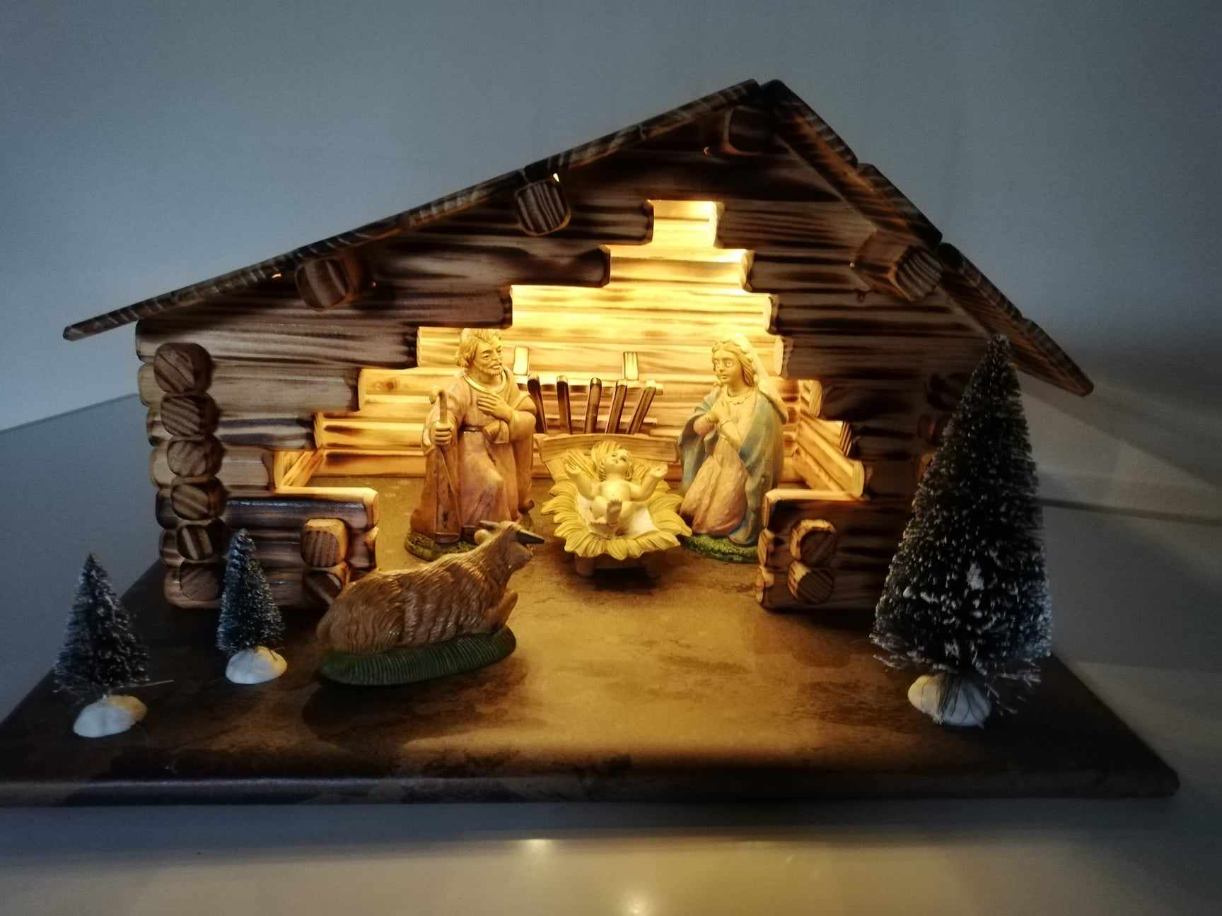 Crèche de Noël illuminée de fabrication artisanale sans les santons.