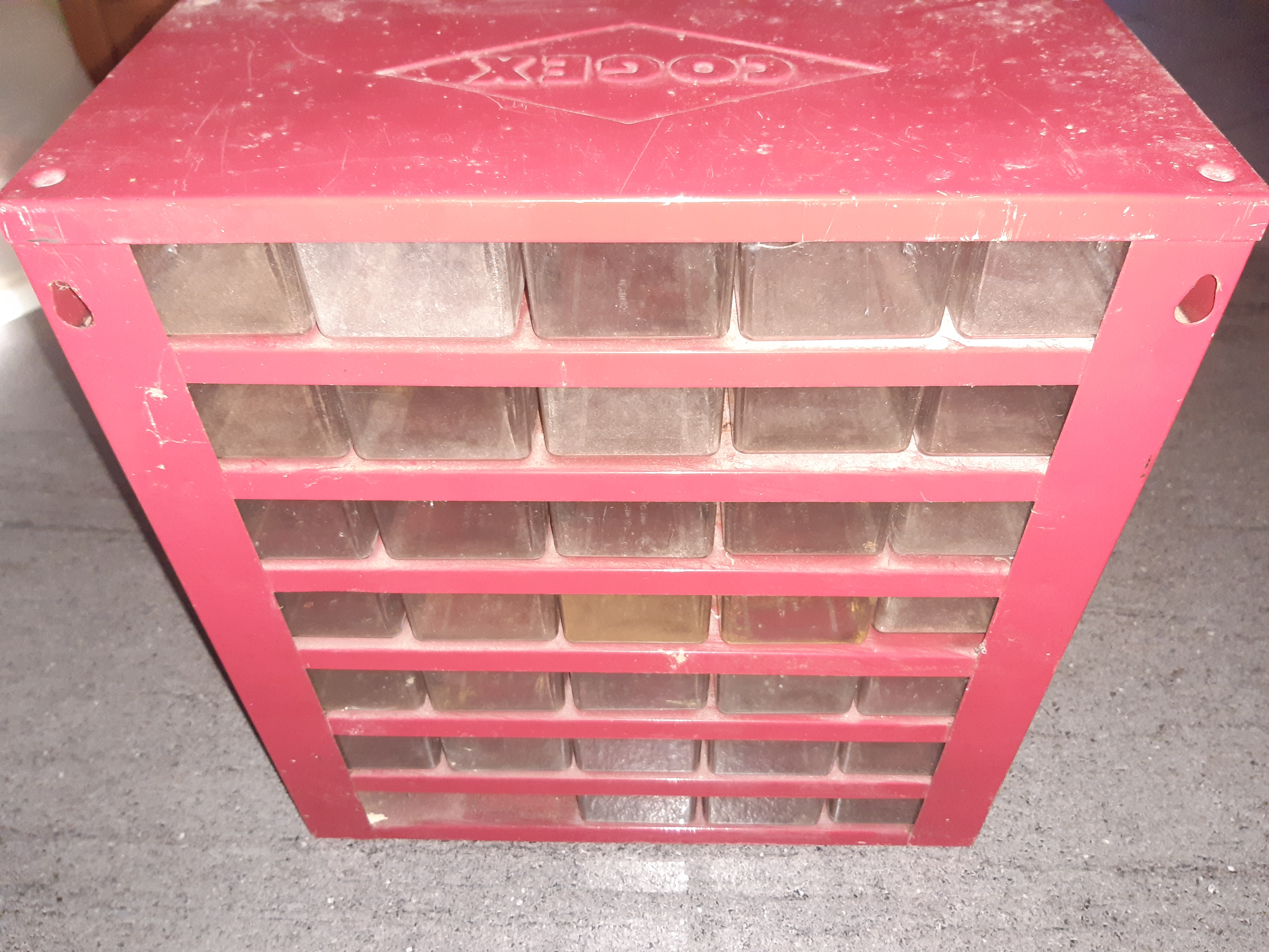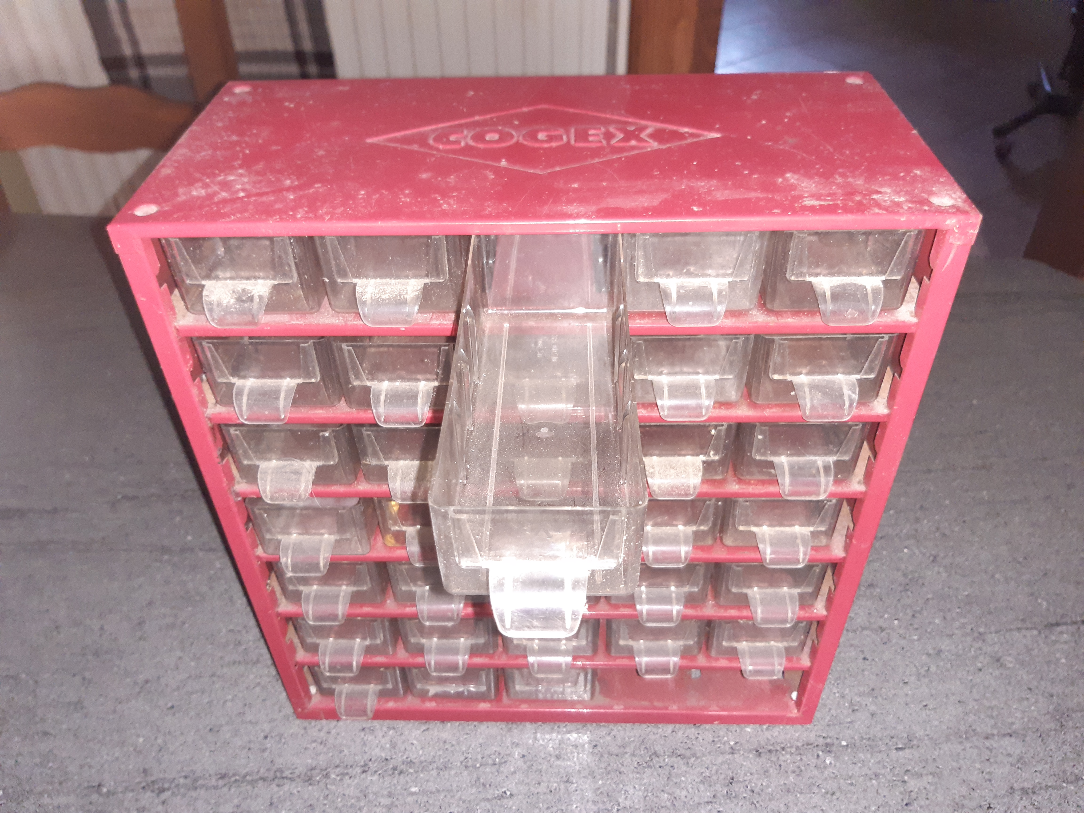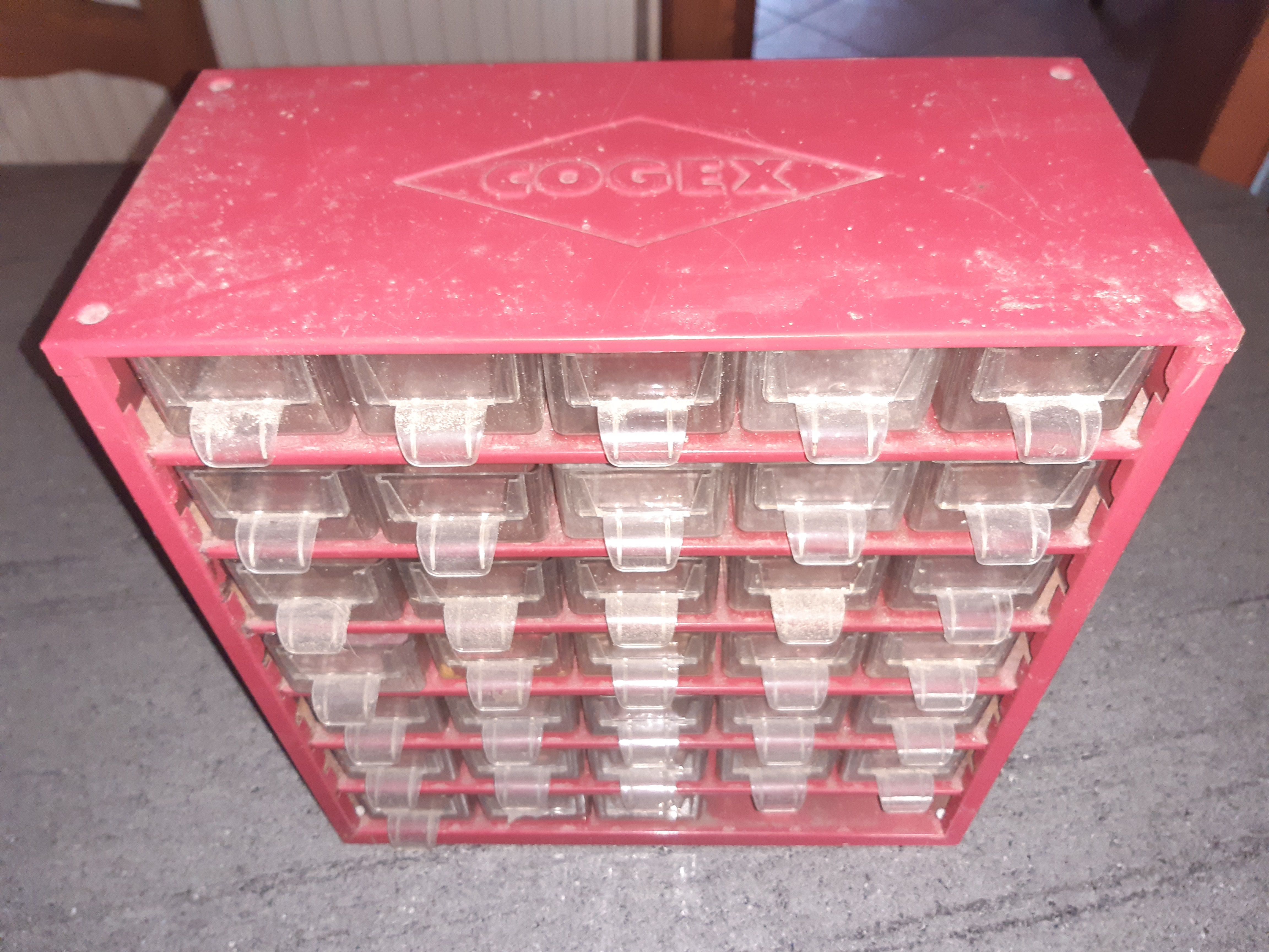 Casier de rangement Cogex de 31 cm de large sur 33 cm de haut et 15 cm de prof avec 35 compartiments à suspendre ou à poser, très pratique, idéal pour visseries ou autres.