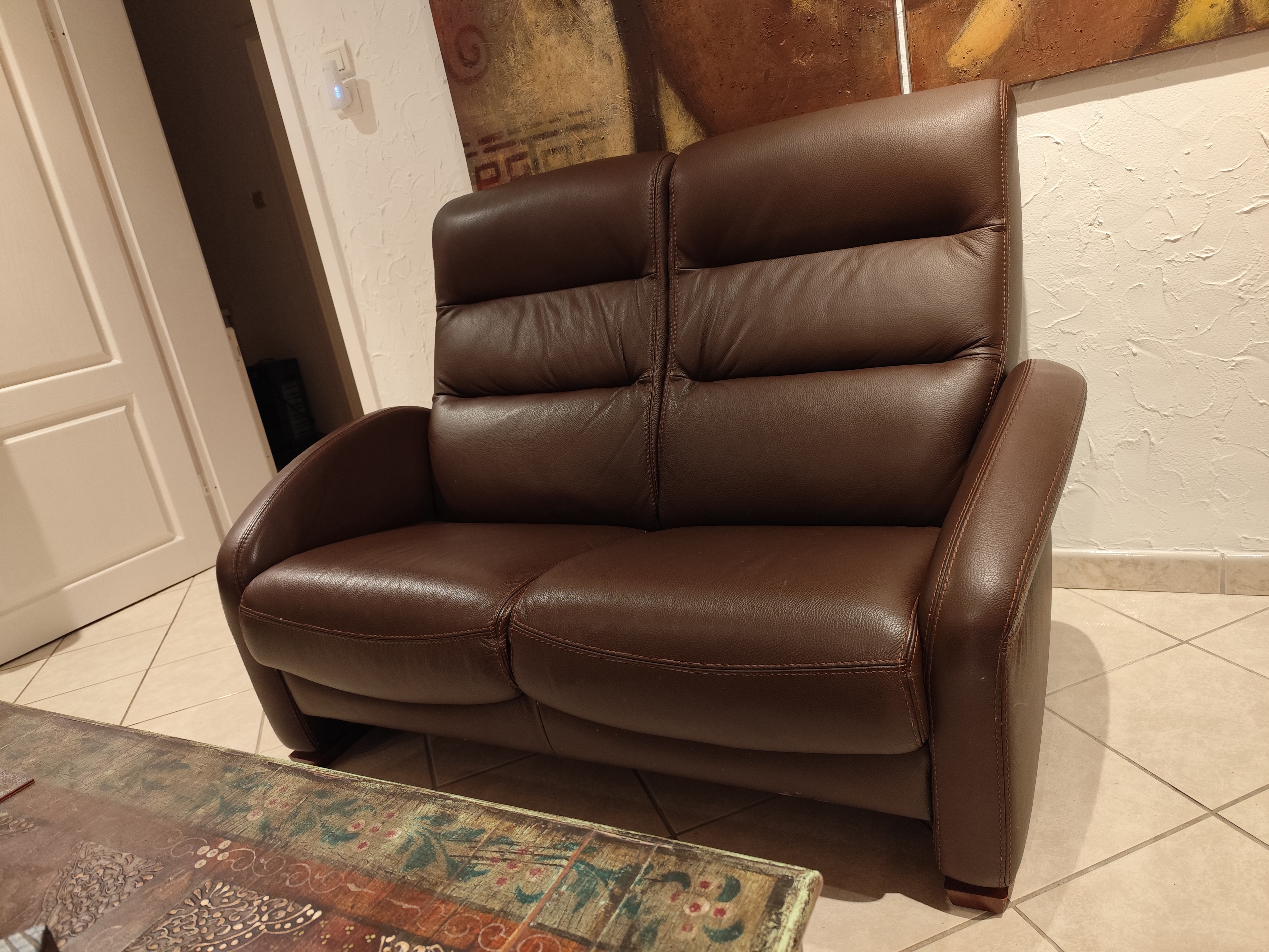 2 canapés cuir brun en bon état. Dimension du 3 places 1,94m. Dimension du 2 places 1,40m. 400 £ les 2.