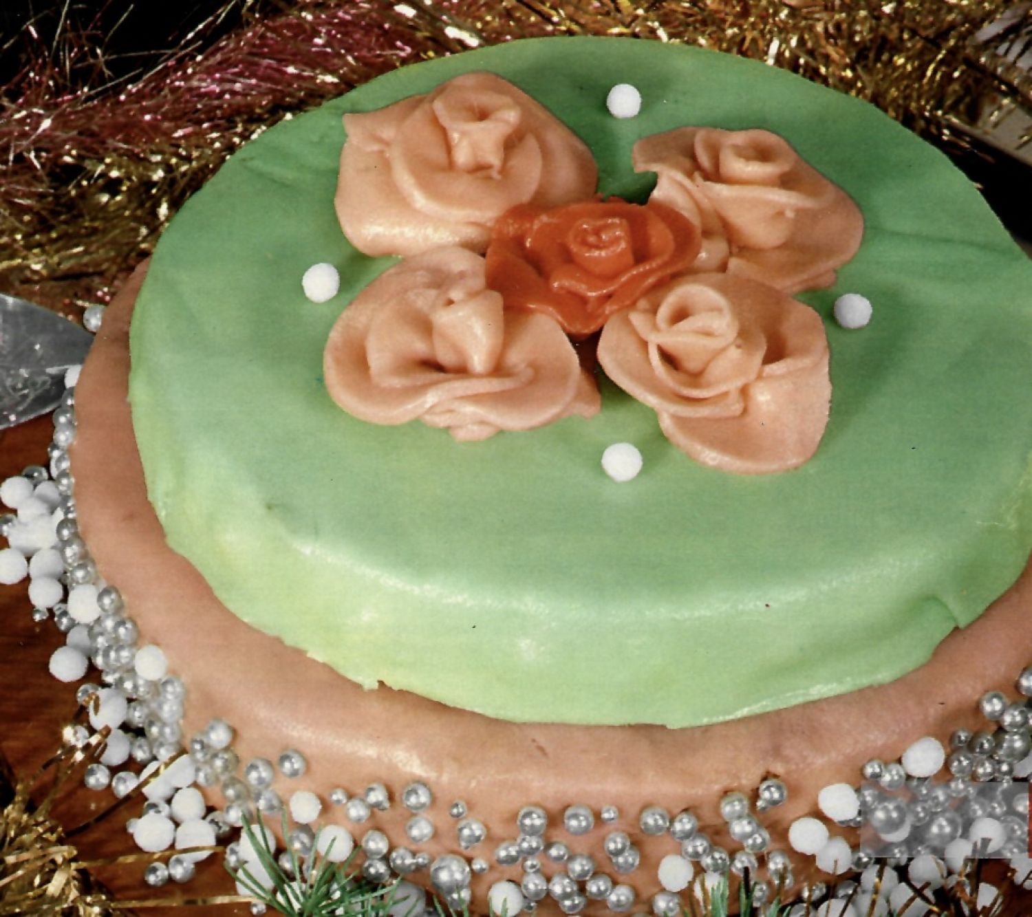 Le lendemain, parfumer la confiture d’abricots avec du kirsch. Couper les génoises en deux dans le sens de l’épaisseur, tartiner le fond de chacune avec la marmelade parfumée et replacer les parties du dessus. Faire tiédir séparément les pâtes d’amandes colorées, placer chacune d’elles entre 2 feuilles de papier sulfurisé et les abaisser au rouleau. Envelopper chaque génoise dans une feuille de pâte d’amandes, l’une dans la rose, l’autre dans la verte. Superposer les deux gâteaux et garnir le pourtour avec les perles argentées. Décorer le dessus avec des roses et des feuilles façonnées ou découpées dans les restes de pâte d’amandes. Ce gâteau brillera comme l’arbre de Noël?!