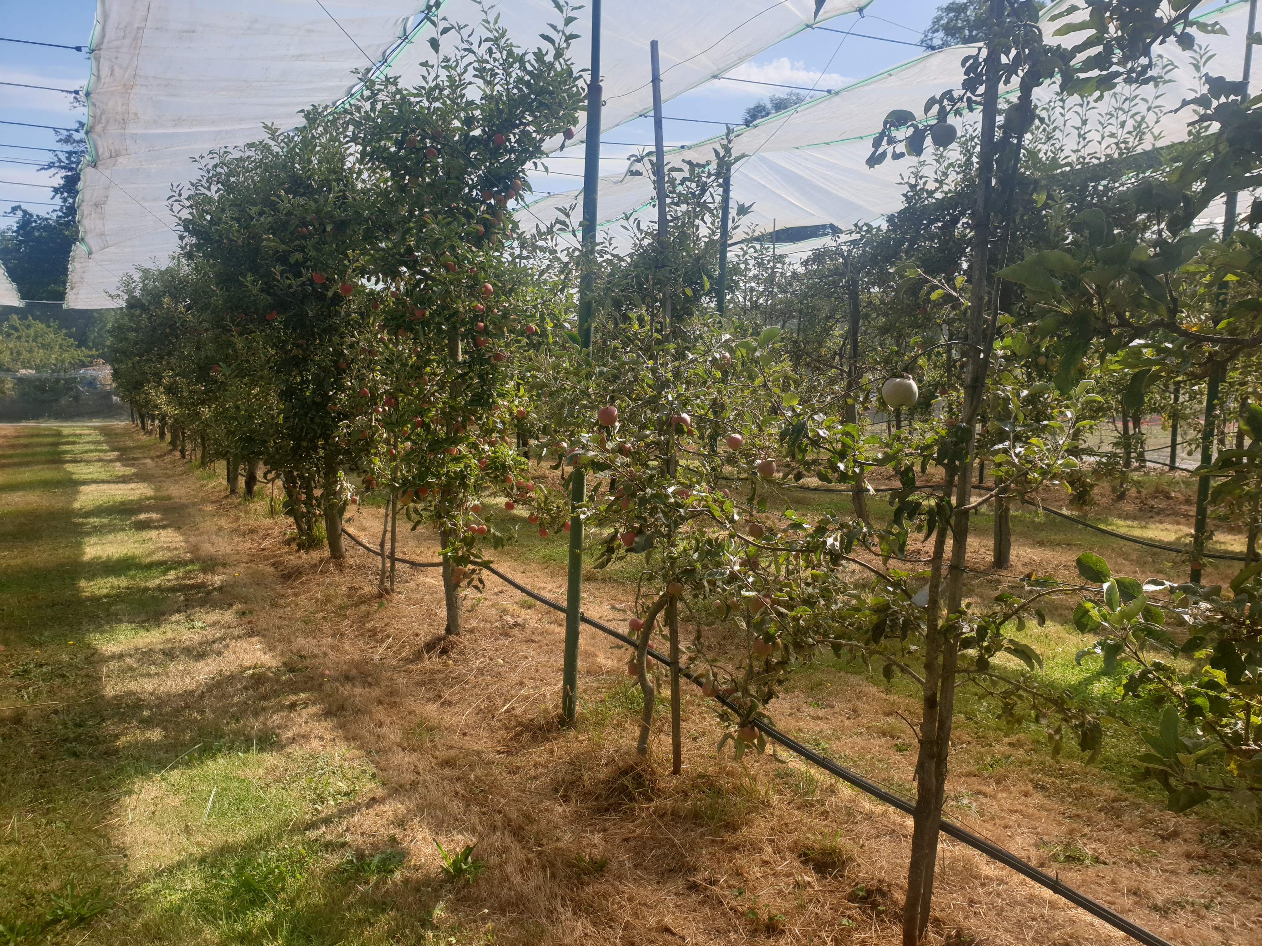 Pour protéger ses fruits, Hubert a installé partout des grandes bâches contre les ravageurs, mais aussi pour les protéger de tous les phénomènes météorologiques : la pluie, les gelées tardives et le soleil.