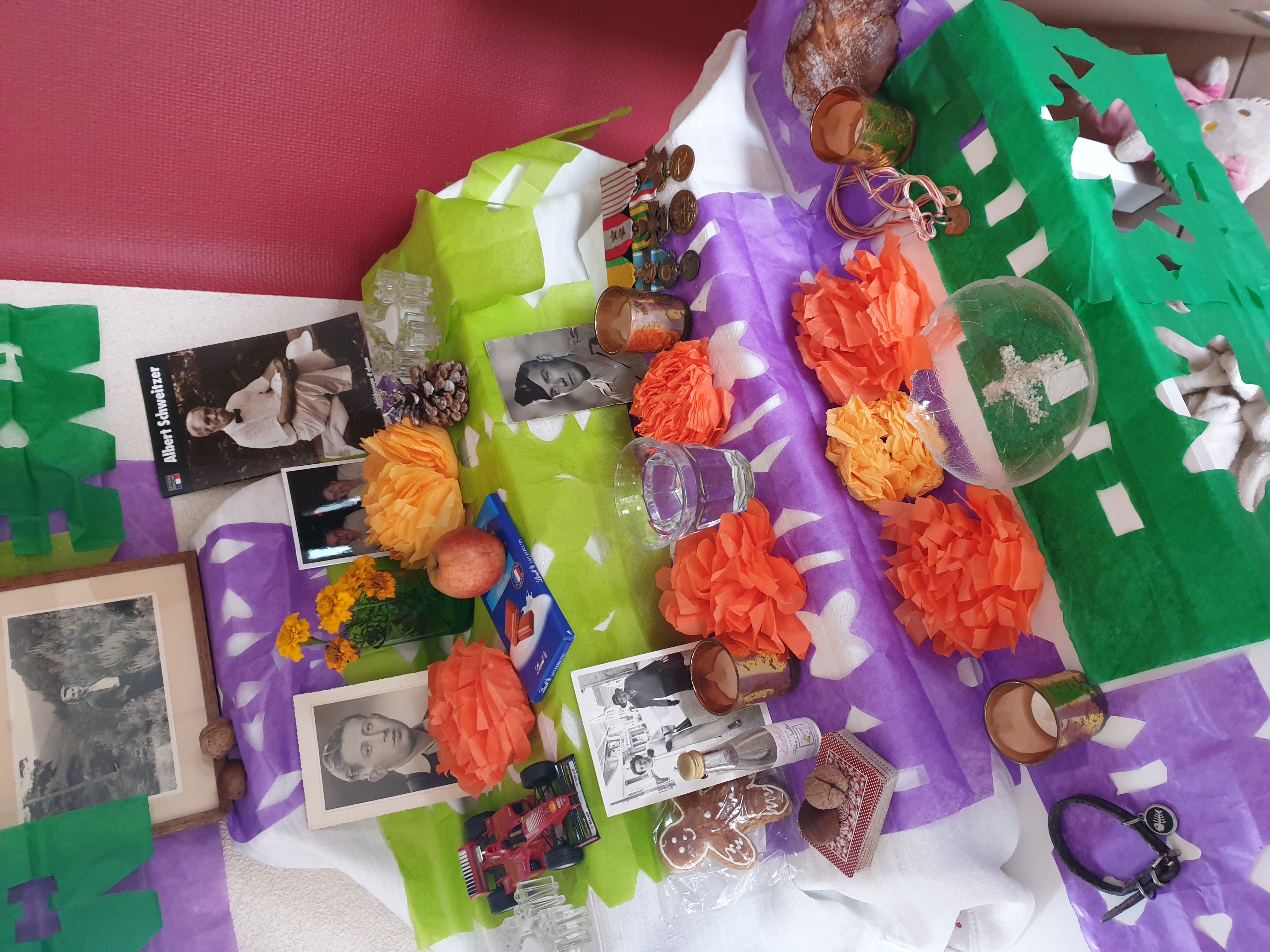On voyage en apprenant ce que ces jeunes peuvent nous apprendre par des mets qu’on va préparer ensemble par exemple. Vous voyez là El altar de muertos, ça c’est Mexicain nous l’avons créé avec Romina. C’est une tradition mexicaine, c’est en mémoire des morts.