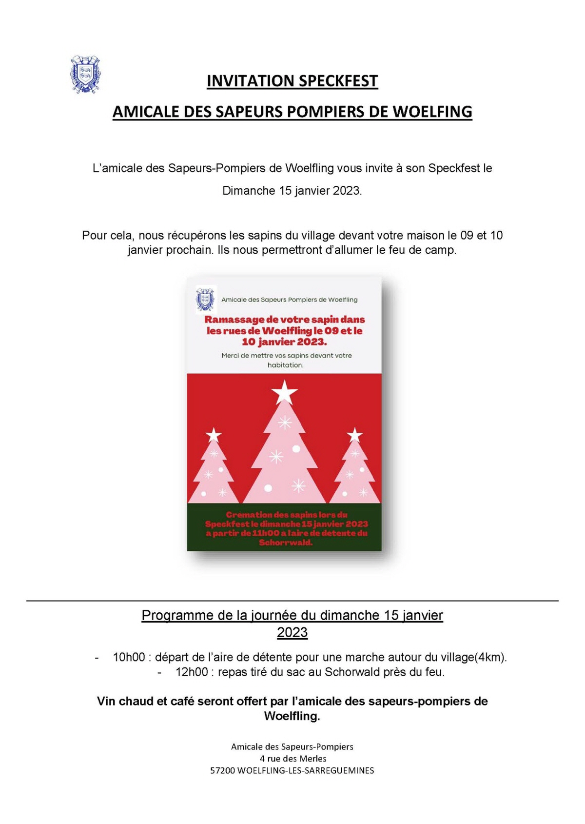 - Une randonnée Speckfest est organisée ce dimanche 15 janvier à 10h à Woelfling-les-Sarreguemines. Au programme : une marche de 4 km autour du village. Rendez-vous, sur l’aire de détente du Schorrwald.