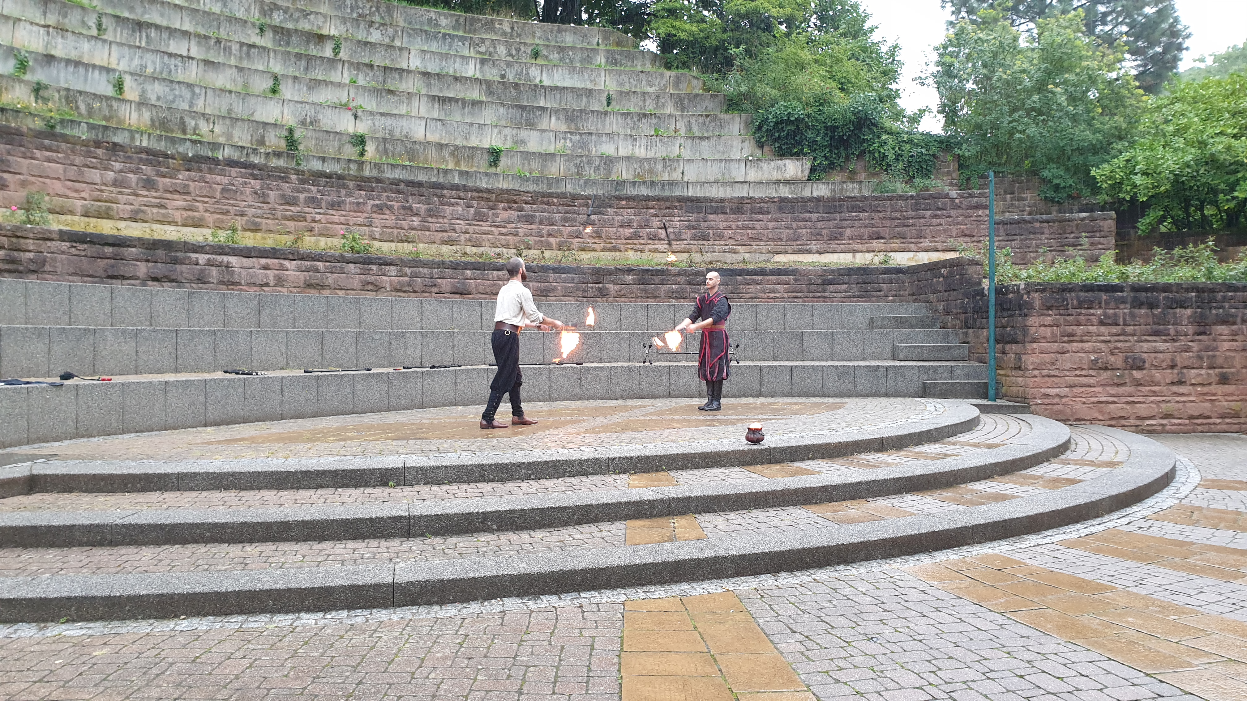 Après, pendant la journée, on va défiler dans le site pour faire des déambulations, jongleries plus traditionnelles. On sera avec des massues, des balles, des sabres.