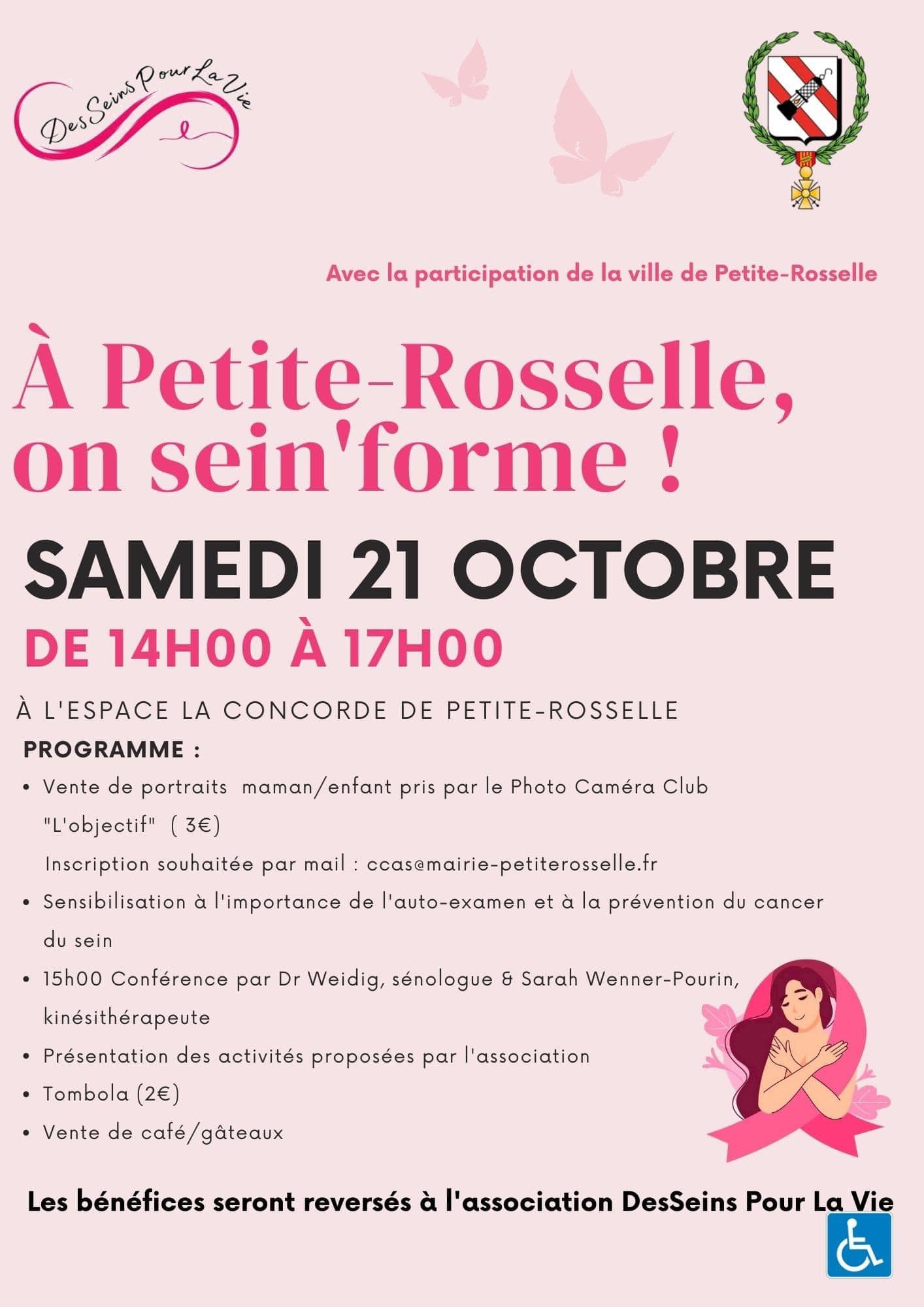 * L’association Des Seins pour la Vie se mobilise pour Octobre Rose à Petite-Rosselle. Ce samedi après-midi, à l’espace Concorde de Petite-Rosselle, plusieurs animations sont prévues pour évoquer le cancer du sein et s’en prémunir. Il y aura une sensibilisation à l’importance de l’auto-examen ou encore une conférence avec un sénologue et une kiné. C’est de 14h à 17h.