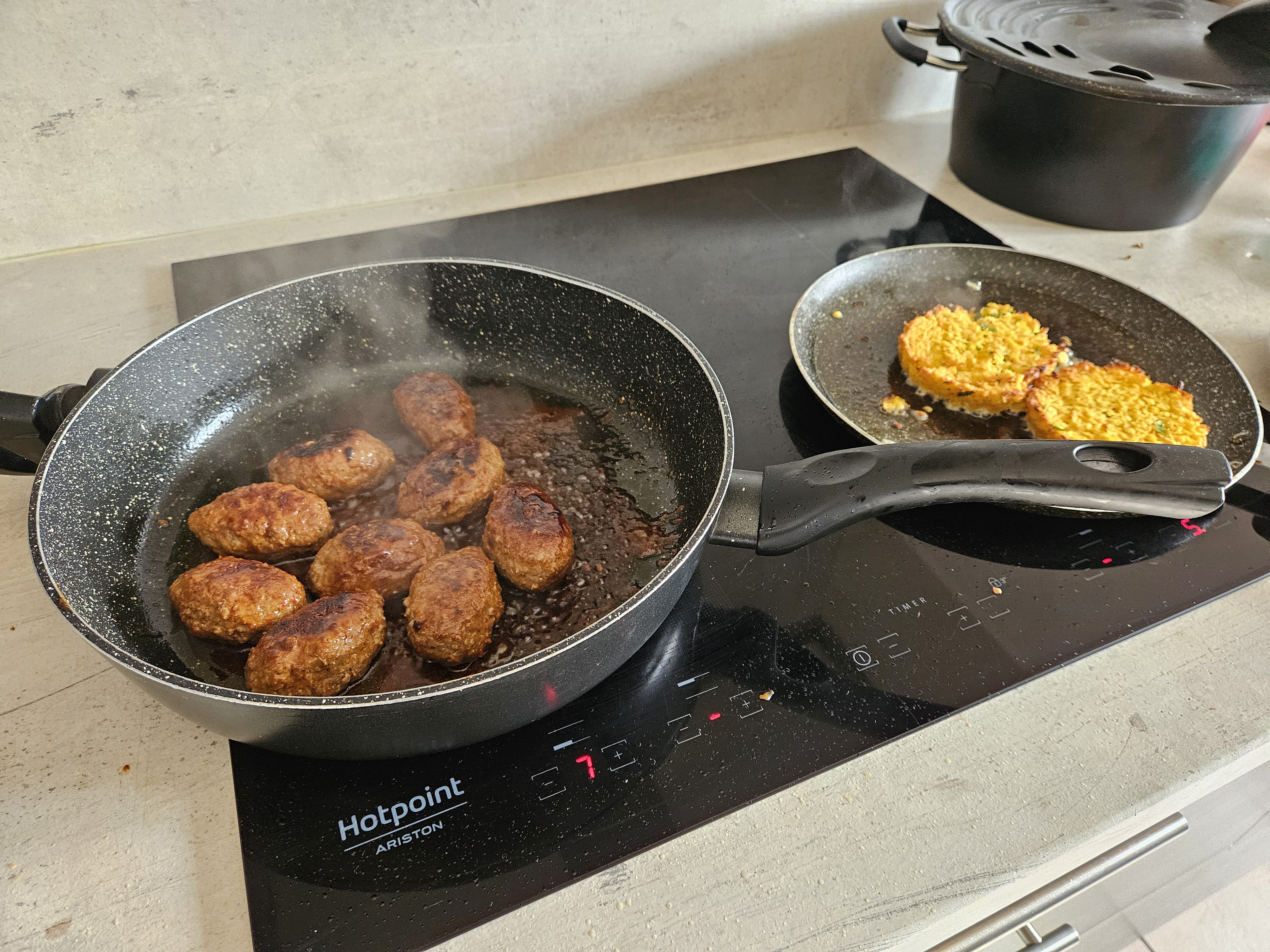 On a notre petit compartiment pour nous et sinon j’ai un deuxième frigo en bas déposer les plats une fois qu’ils sont prêts. Là on prépare les petites boulettes mexicaines, là j’ai un veggie.