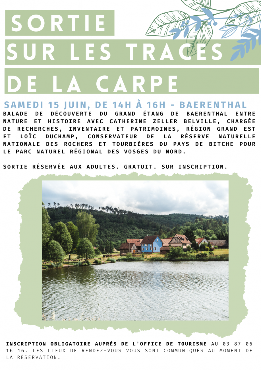Une balade de découverte du grand étang de Baerenthal est proposée par l’office de tourisme du Pays de Bitche et le site verrier de Meisenthal. C’est ce samedi de 14 h à 16 h. La sortie est réservée aux adultes et est organisée dans la continuité de l’exposition 2024 du musée du verre de Meisenthal ''Muette la Carpe''. Vous pouvez vous inscrire gratuitement au 03 87 06 16 16 ou par mail à contact@tourisme-paysdebitche.fr.