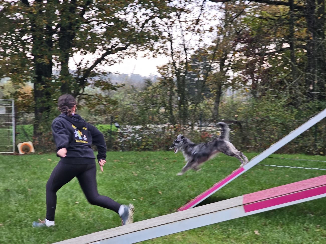 On a des tunnels, après on lui dit tunnel il va à l’intérieur. Il y a le slalom où le chien slalom entre les barres après on a les sauts où il saute au-dessus. La passerelle, la balance et à la fin des cônes et tout, on a des petites rayures roses, il faut que le chien ait les 4 pattes dans le rose. Sinon, si, par exemple il saute au-dessus du rose c’est une faute en concours.