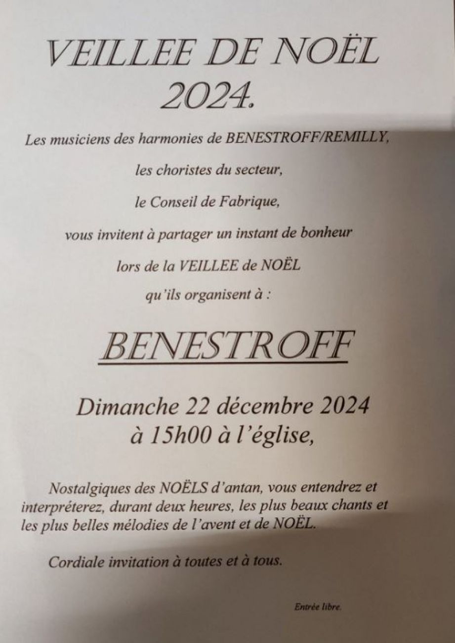 Dimanche à 15h, en l’église de Bénestroff, un concert de 2 heures est programmé par les musiciens des Harmonies de Bénestroff et Rémilly, les choristes de Bénestroff et environs et le Conseil de fabrique. L’entrée est libre.