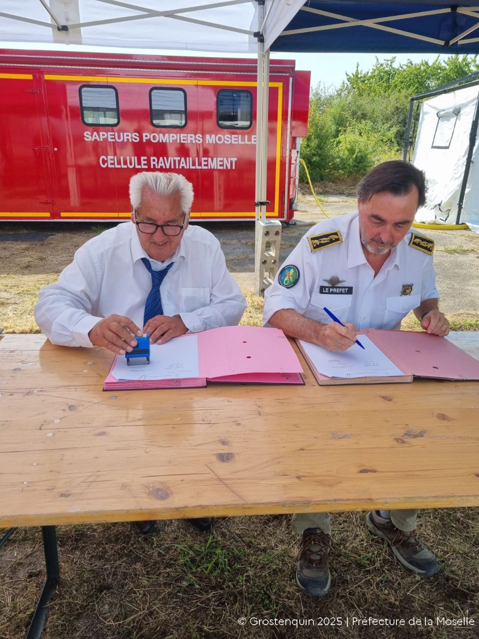 Le pasteur Charpentier signe le protocole pour le bon déroulé du rassemblement, en compagnie de Pascal Bolot, préfet de la Moselle