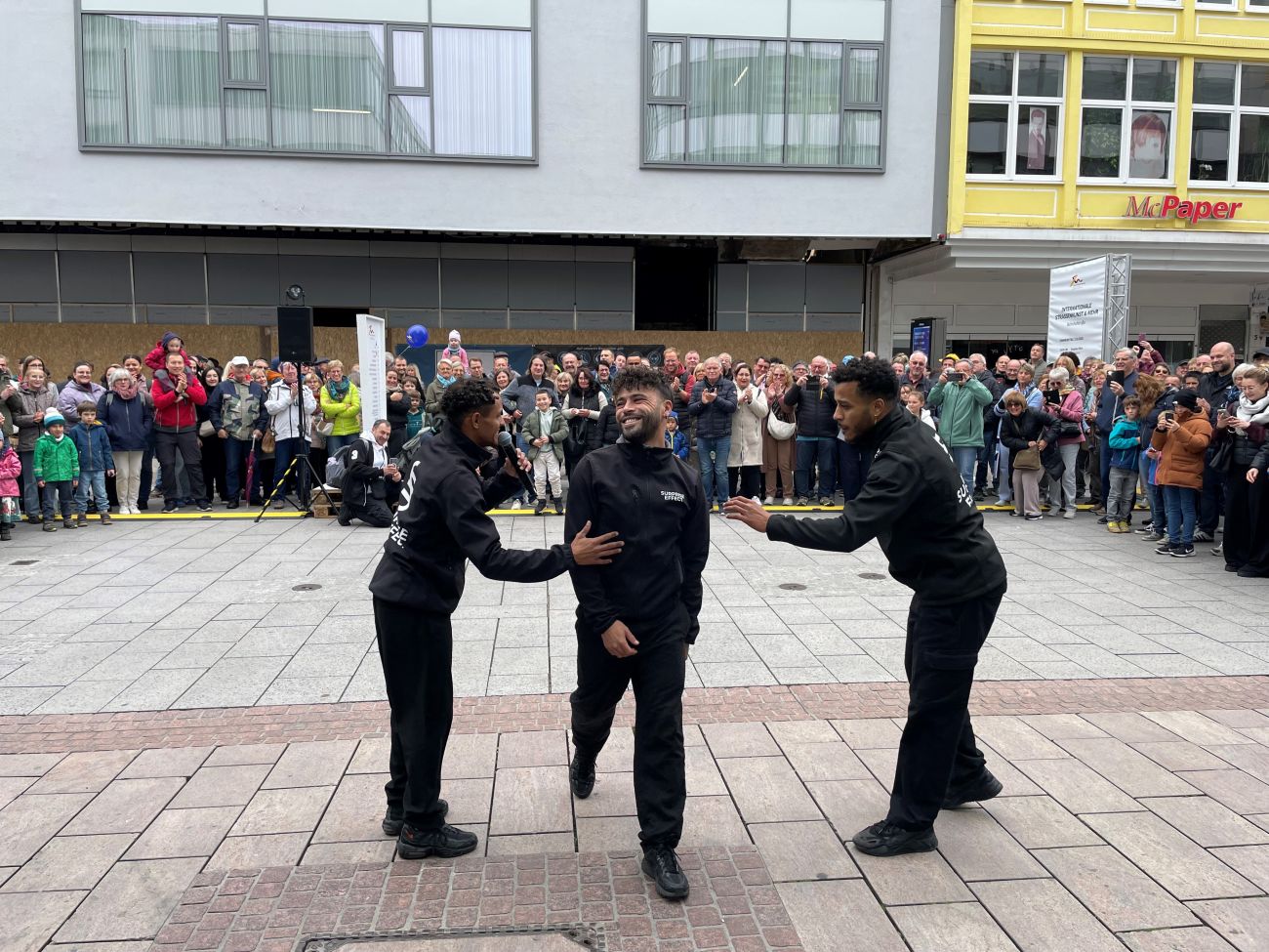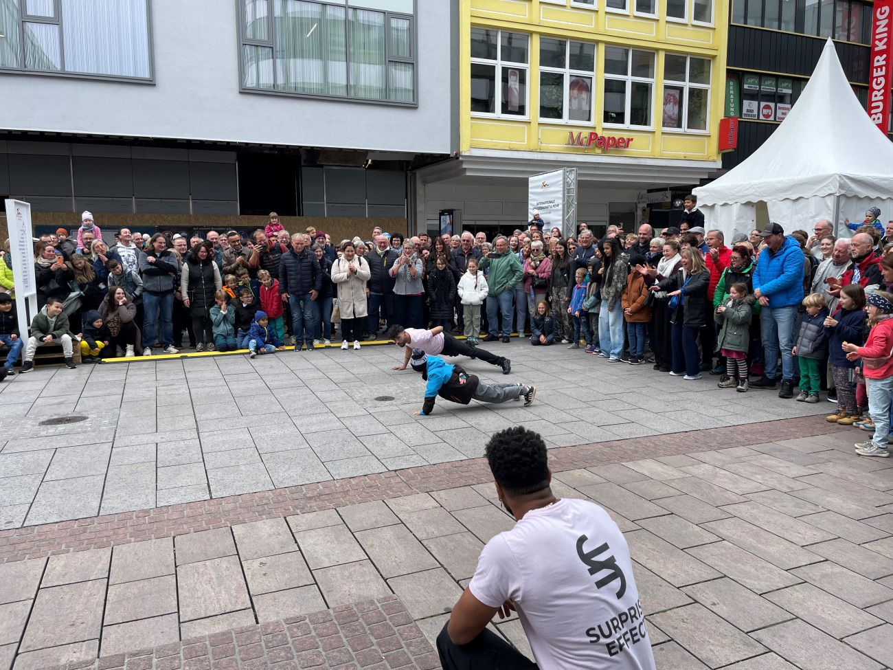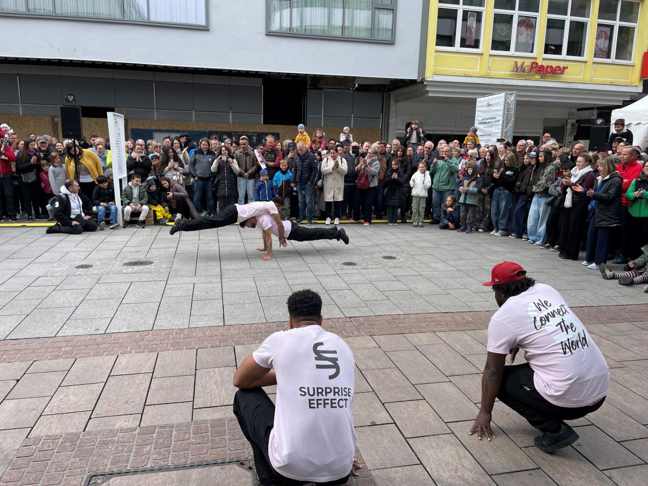 Il y a un festival d'arts de rue, on a postulé, et on a été invité pour y participer. On fait des grosses tournées en Allemagne, et nous voilà aujourd'hui à Sarrebruck, avec un public de folie, et beaucoup de monde !
