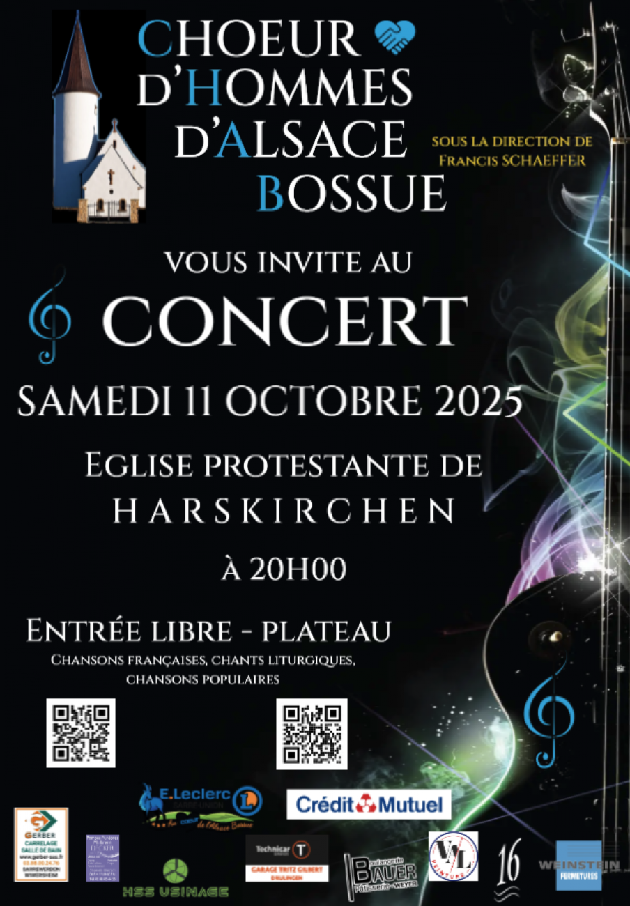 Un Concert du Chœur d’Hommes d’Alsace Bossue a lieu ce samedi soir en l’église protestante de Harskirchen, à partir de 20h. Entrée libre.