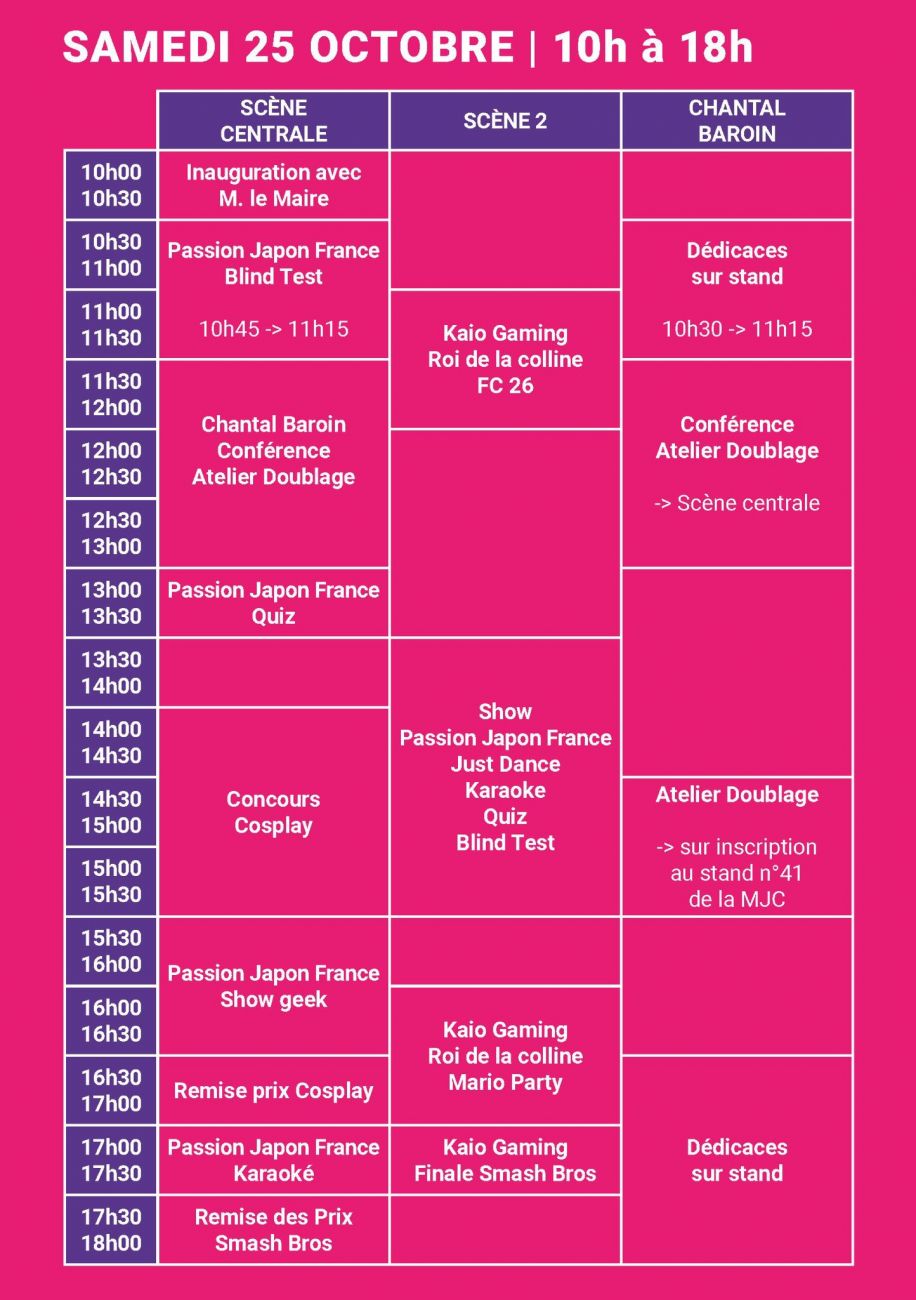 Sur place, vous retrouverez de la restauration classique et japonaise. Comptez 2€ l’entrée, c’est gratuit pour les moins de 18 ans. L’année dernière, plus de 5000 visiteurs étaient présents, record à battre les 25 et 26 octobre à l’Agora. Tout le programme ici.