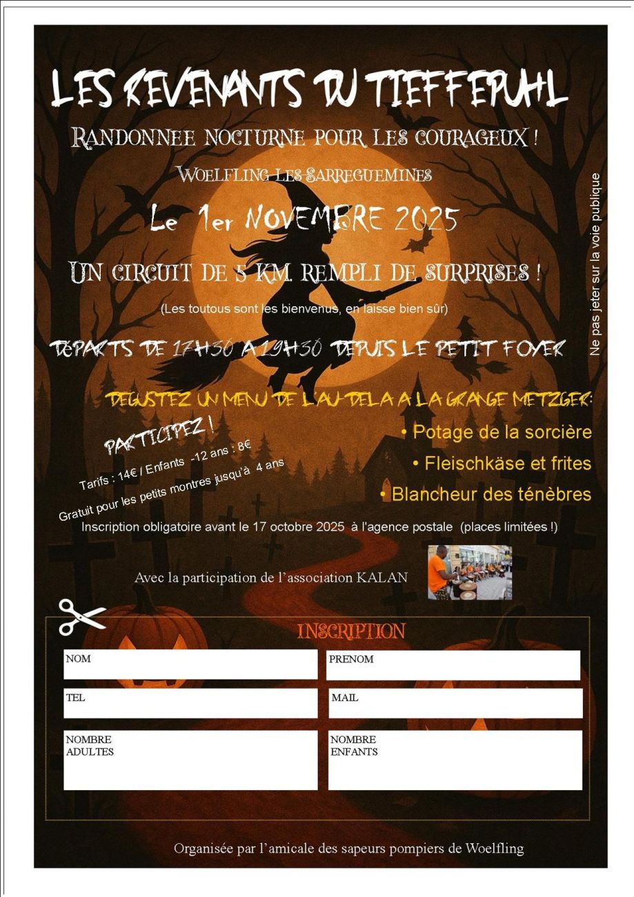 L'amicale des anciens sapeurs-pompiers de Woelfling-lès-Sarreguemines organise une randonnée nocturne pour Halloween ce samedi à partir de 17h30 et avec des départs jusqu'à 19h30 au petit foyer.
