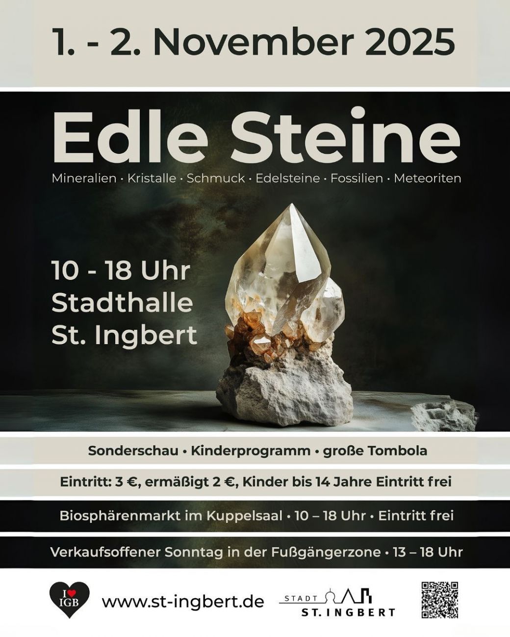 La bourse Edle Steine consacrée aux minéraux, belles pierres, bijoux et fossiles s’invite le 1er et 2 novembre à St. Ingbert en Sarre. Ça se déroule à la Stadthalle de 10h à 18h. Un autre temps fort sera une exposition spéciale consacrée aux poissons préhistoriques ayant vécu à des ères différentes.