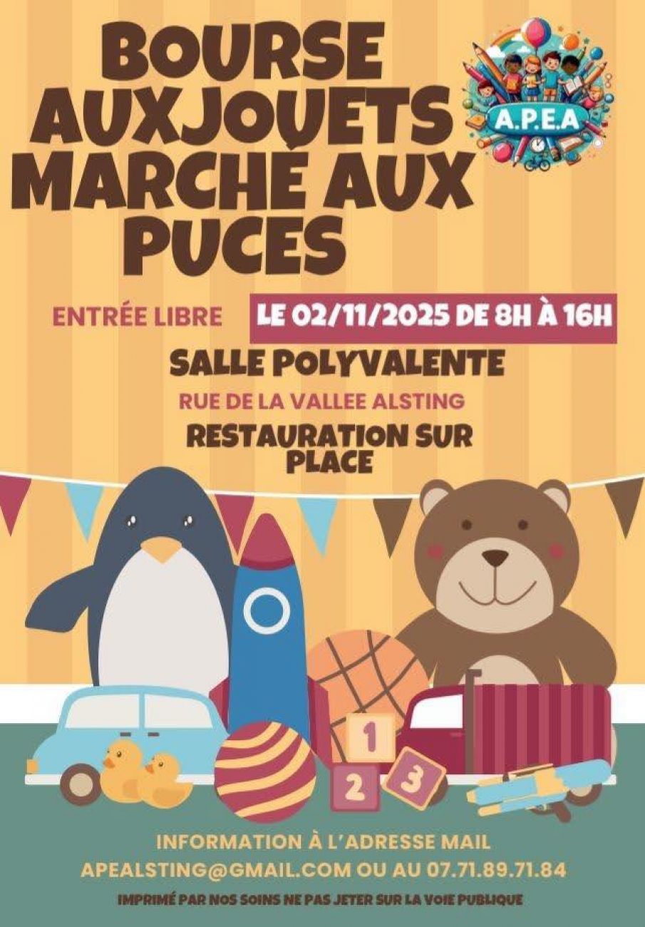 Un marché aux puces et une bourse aux jouets sont organisés à la salle polyvalente d’Alsting ce dimanche de 8h à 16h.