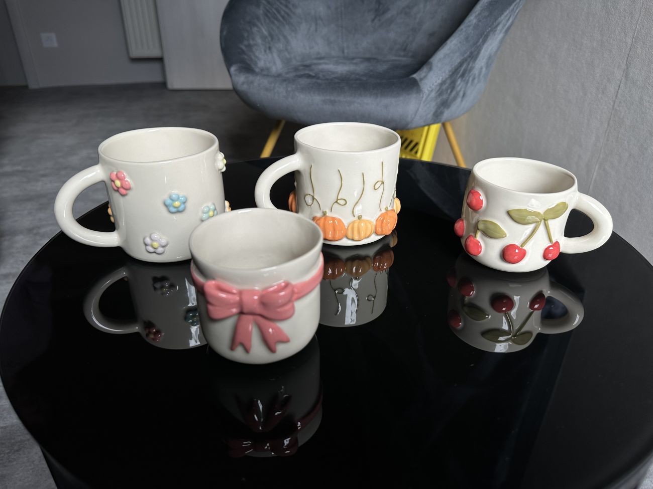 Ma touche personnelle, c’est les fleurs. Je travaille surtout sur les couleurs pastel, avec toujours quelque chose de très coloré. Je travaille principalement sur des tasses avec des motifs avec des reliefs, en fonction des saisons.