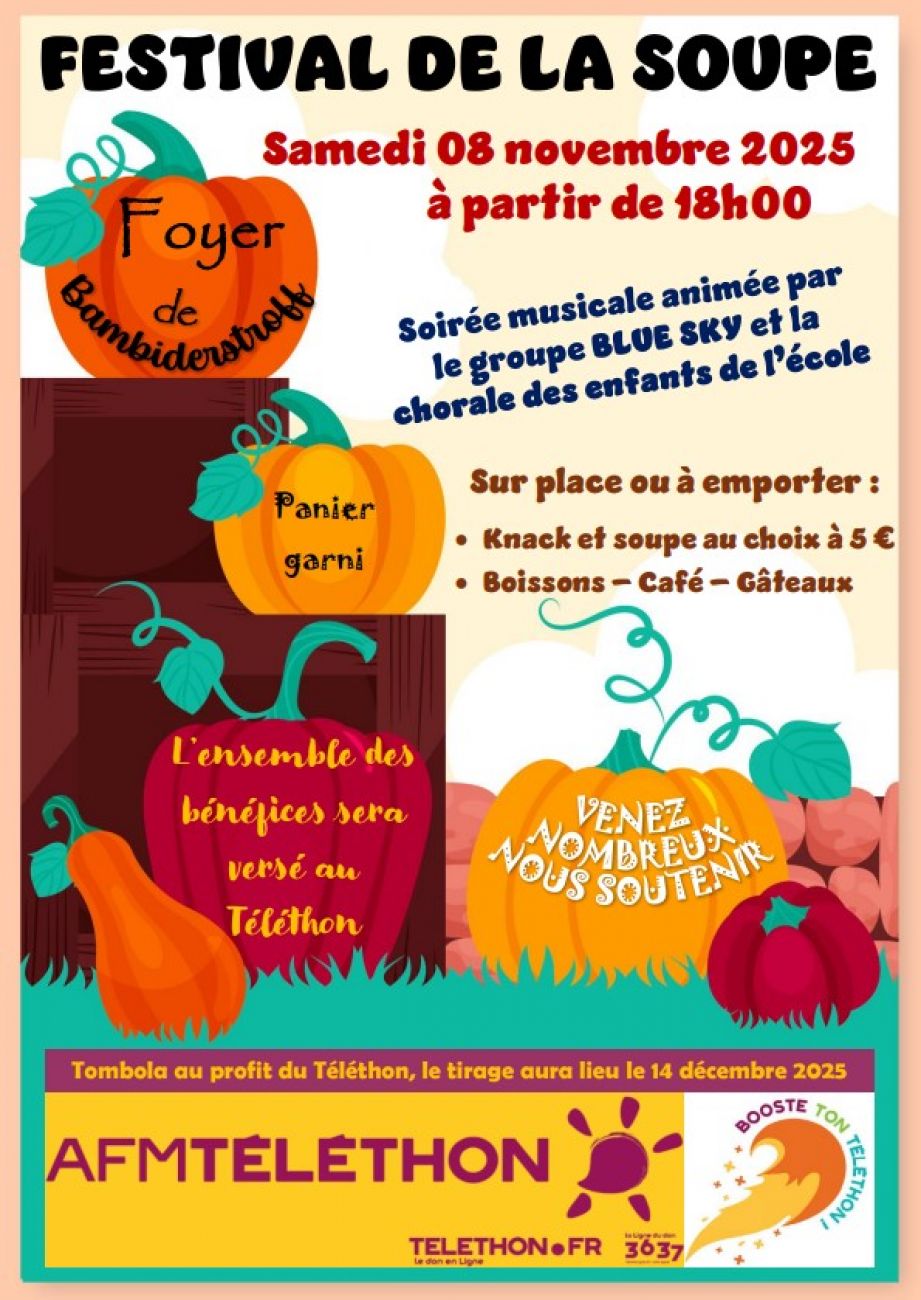 Rendez-vous au foyer communal de Bambiderstroff samedi soir dès 18h pour un festival de la soupe au profit du Téléthon, le tout en musique. L’entrée est libre.