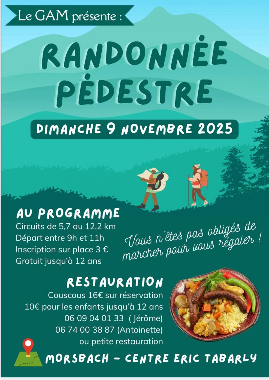 Le groupement des associations de Morsbach propose une randonnée pédestre ce dimanche au départ du centre Eric Tabarly. Les départs peuvent se faire entre 9h et 11h avec des circuits allant de 5 à 12 km. Coût de la participation 3 euros.