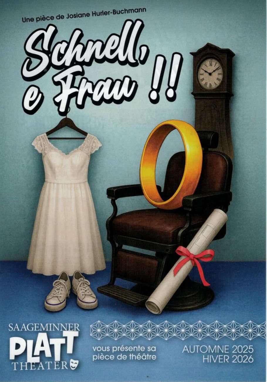 Le "Saageminner Platt Theater" est de retour et vous propose une nouvelle pièce « Schnell, e Frau !! ». Les représentations se dérouleront au casino des Faïenceries à Sarreguemines samedi à 20h et dimanche à 14h30. Entrée 12 euros
