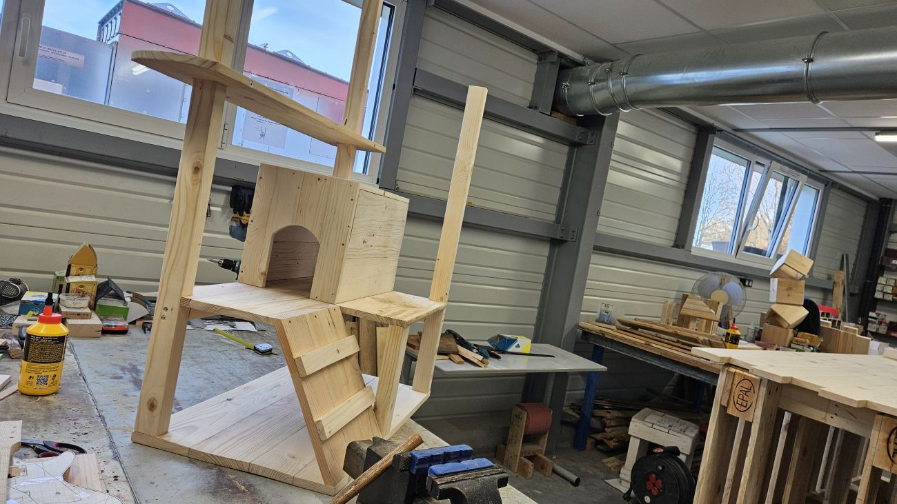 Il nous montre les plans des dizaines d’objets sur lesquels il a déjà travaillé, bac à fleurs, cheval à bascule ou encore mangeoire pour écureuil. Ce matin, il peaufine un abat-jour pour sa dernière création.