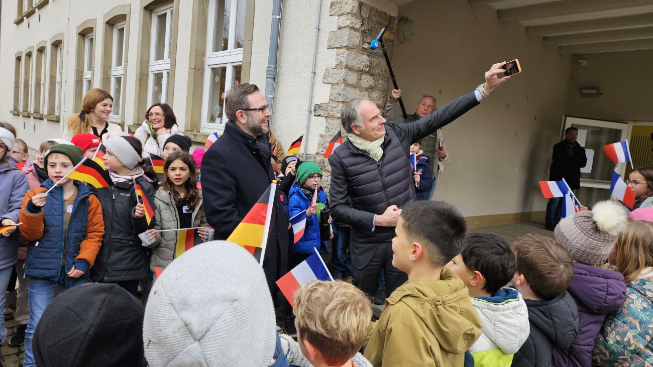C’est en chanson et avec une haie d’honneur de petits drapeaux français et allemands, que les élèves accueillent le Consul général de France à Sarrebruck, Jérôme Spinoza, venu pour saluer ce nouveau partenariat entre les deux écoles.