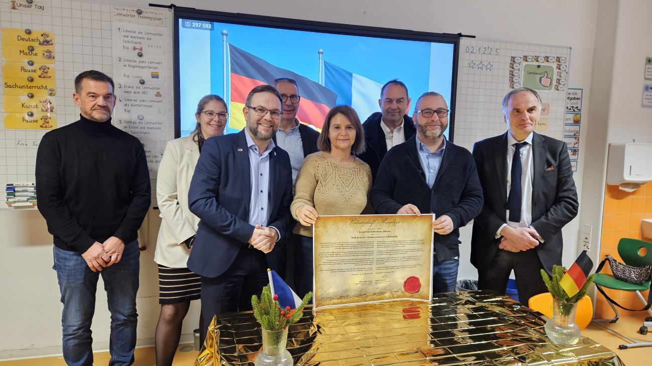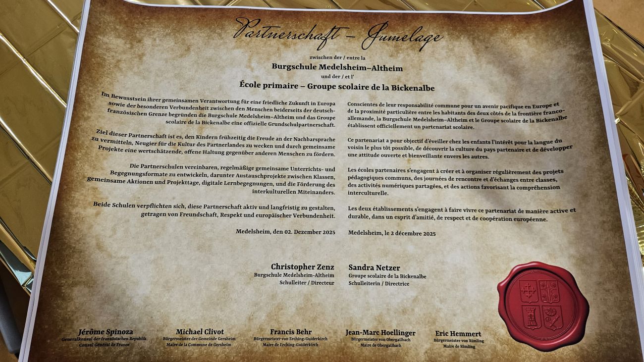 Dans la salle de classe, une charte de jumelage donne la direction voulue par tous les signataires comme le maire de Gersheim, Michael Clivot, qui se réjouit de voir les deux écoles collaborer pour apprendre la langue, mais pas uniquement.