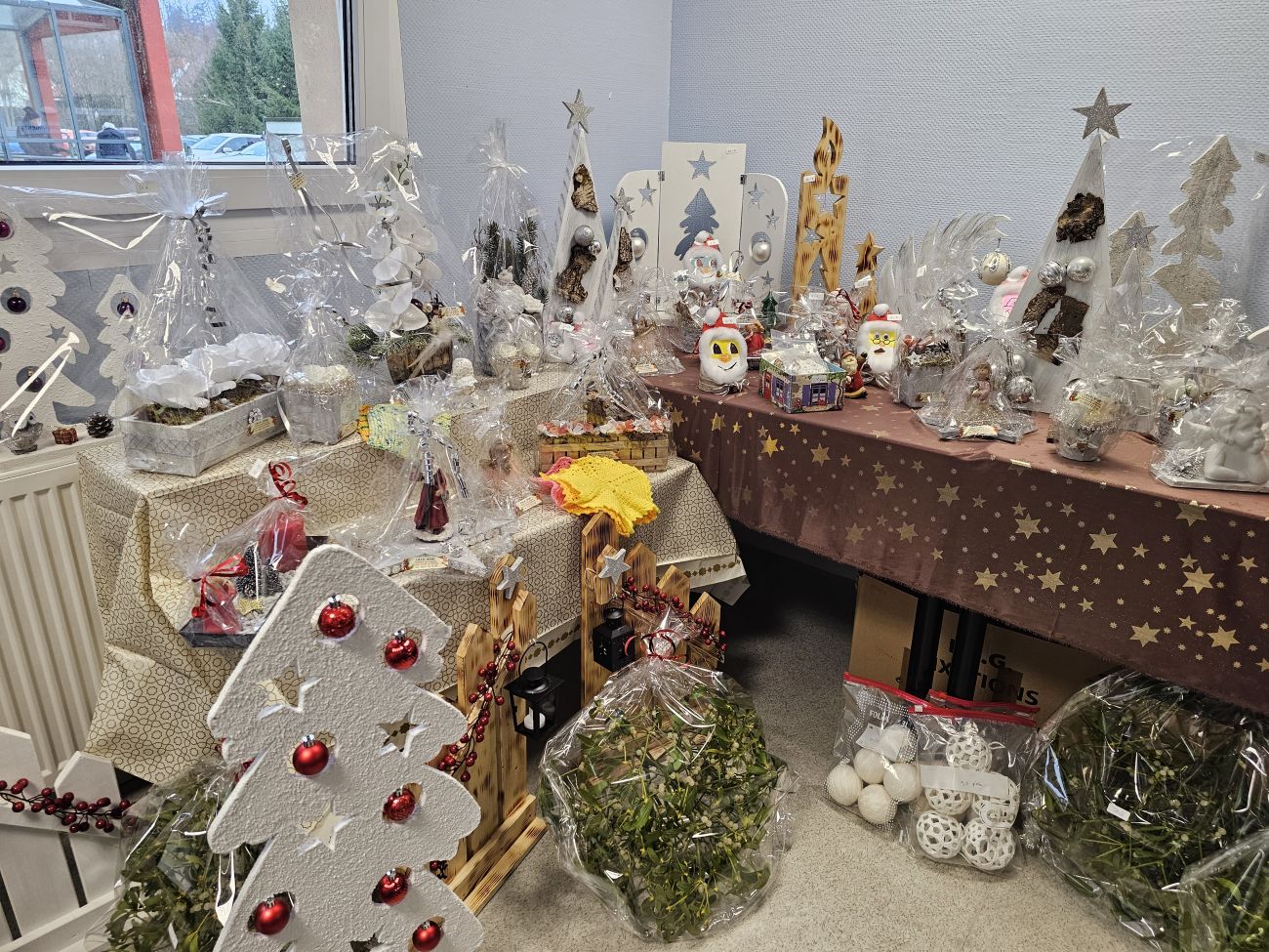 A l’entrée de l’hôpital Saint-Joseph, il suffit de suivre les flèches et la musique de Noël pour tomber sur les bénévoles. Pour l’ouverture, ce mardi, Marie-Claire, Anne-Marie et Nicole, trois Bitchoises assurent la permanence et peaufinent la mise en place des objets.