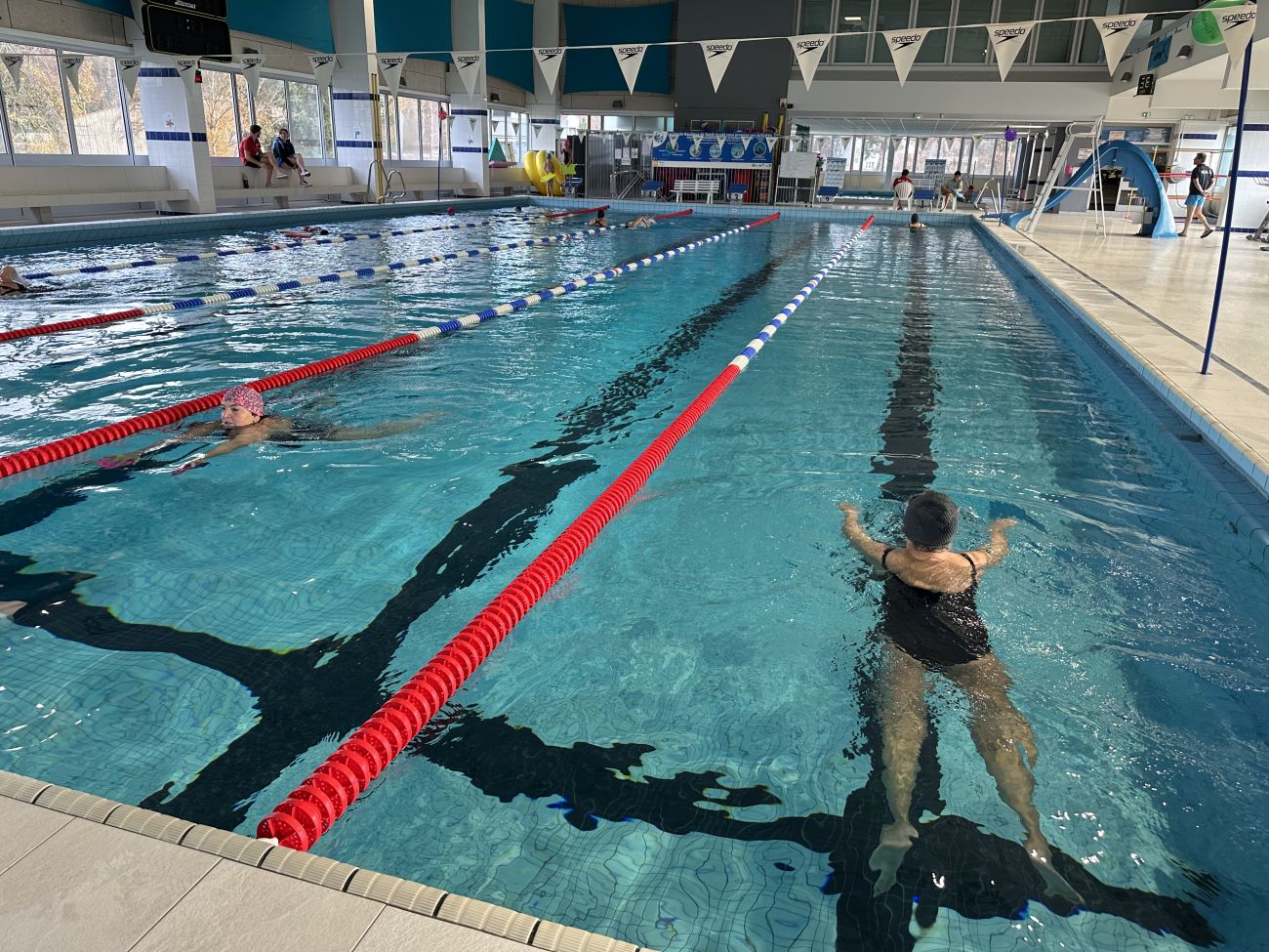 Dans l’eau, les nageurs enchaînent les longueurs. Martine nage, ici, tous les mercredis. Aujourd’hui, elle ne participe pas au challenge du jour du Téléthon, mais elle a tout de même fait un don à l'association, dès son arrivée.