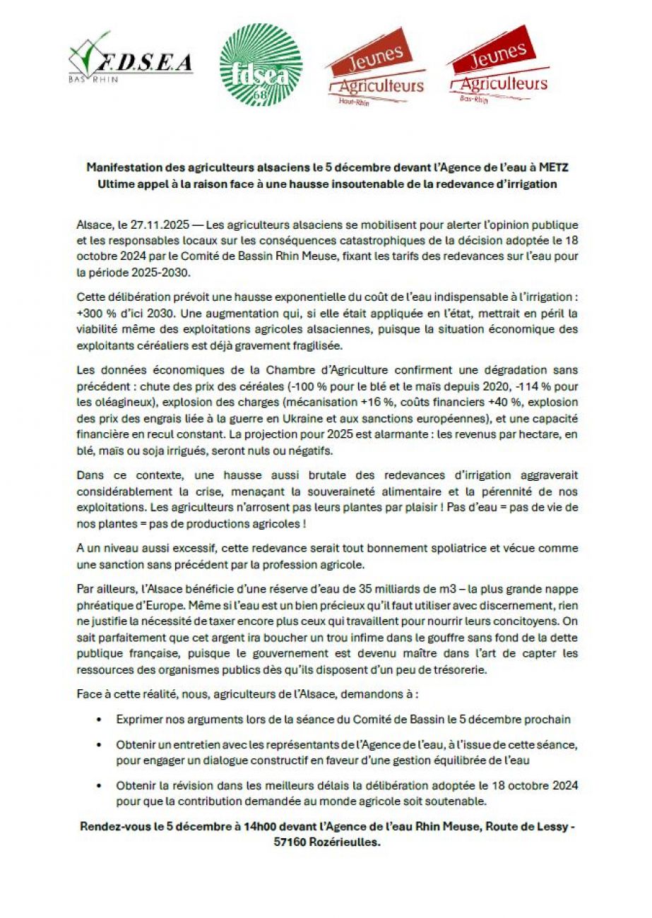 Les agriculteurs alsaciens manifestent aujourd'hui, 5 décembre, contre la hausse de la redevance irrigation. Dans un communiqué, la FDSEA et les jeunes agriculteurs dénoncent des conséquences catastrophiques pour le monde agricole.
