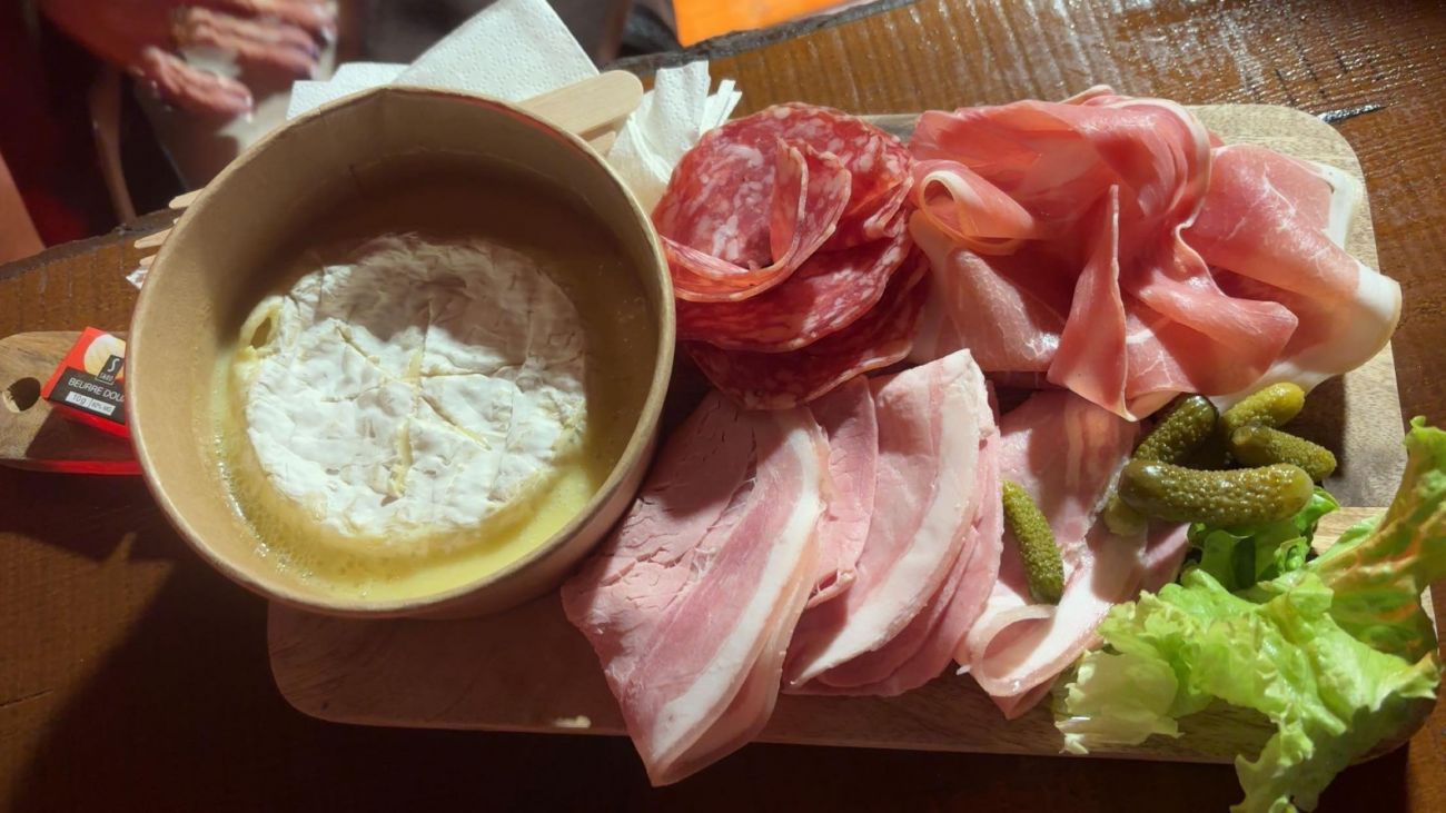 Il y a du jambon fumé, du salami, jambon normal et un camembert frit. Je trouve que ça réconforte, ça amène une convivialité, c’est bien, ça fait un bel esprit de Noël. On rigole, on a un bon petit verre, on a bu un petit chocolat chaud au Baileys, un chocolat chaud au rhum, un bon vin blanc de Noël, c’est top.
