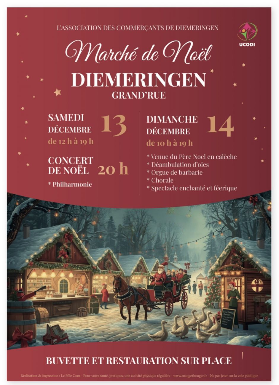 *Marché de Noël authentique à Diemeringen. Les commerçants vous donnent rendez-vous samedi et dimanche dans les rues du centre-ville. Au programme : chorale de rue, orgue de barbarie, spectacles féériques, déambulation d’oies et le père Noël dans sa calèche. Une cinquantaine d’exposants seront présents, samedi de 12h à 19h et dimanche de 10h à 19h. Un concert de Noël de la philharmonie est prévu samedi à 20h.
